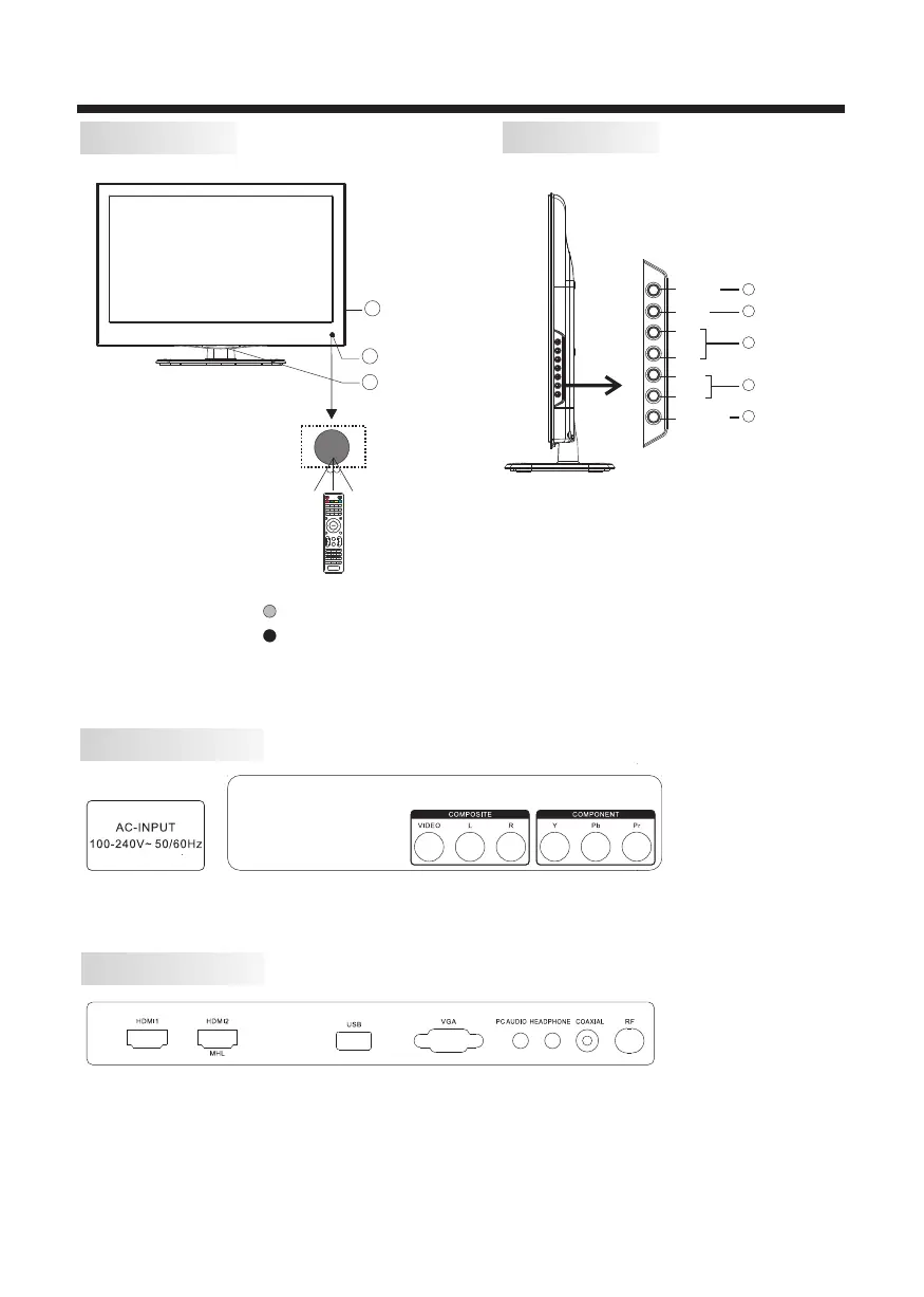 , HDMI2/MHL, USB, VGA, PC AUDIO, HEADPHONE, COAXIAL(audio output), RF.