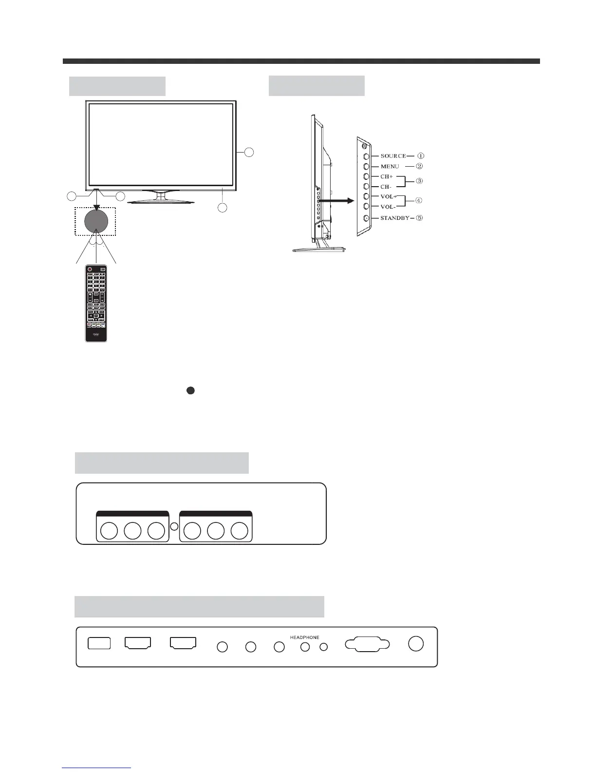 USB, HDMI2, HDMI1, YPbPr INPUT, HEADPHONE, PC AUDIO, VGA, RF.