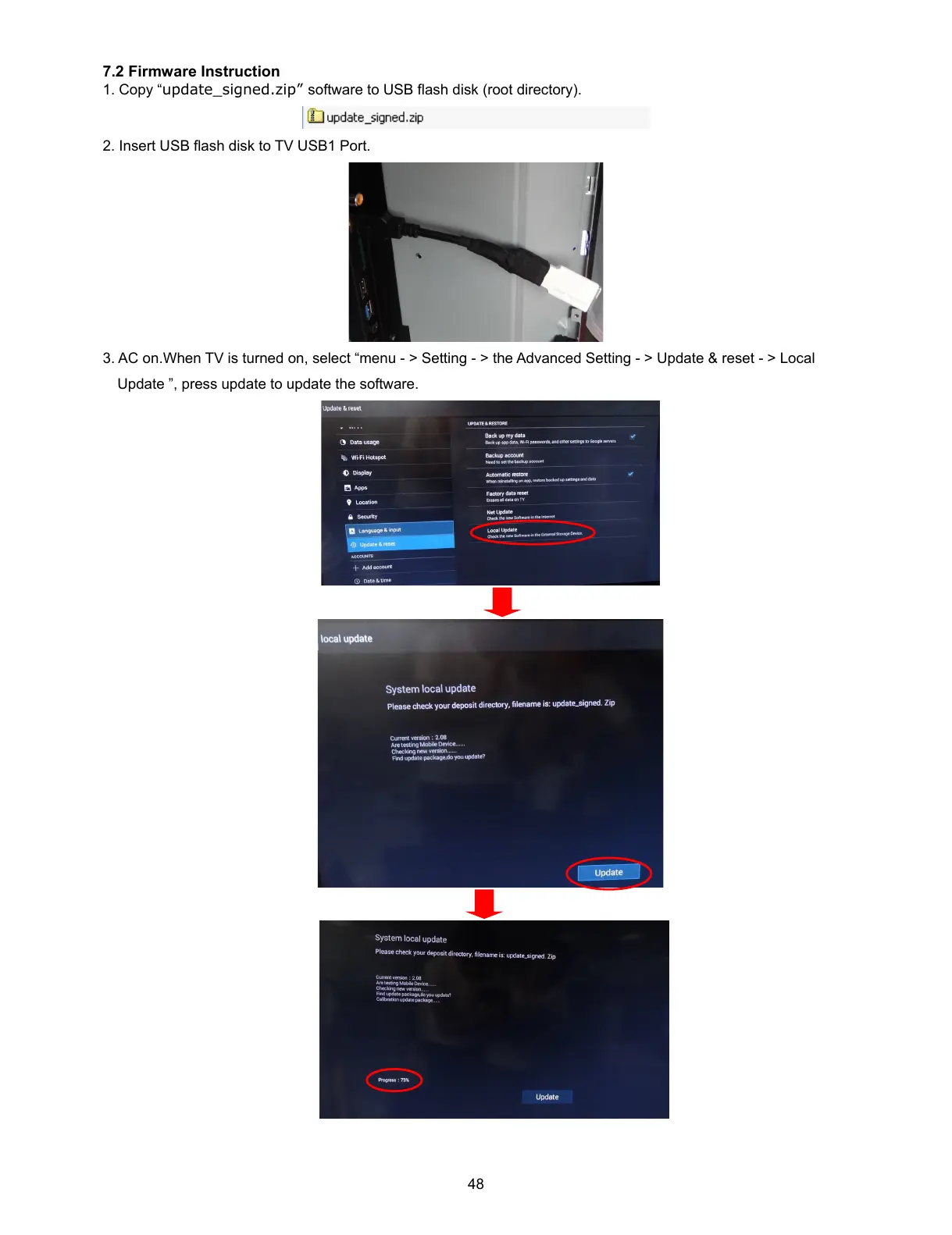 1. Copy “update_signed.zip” software to USB flash disk (root directory).