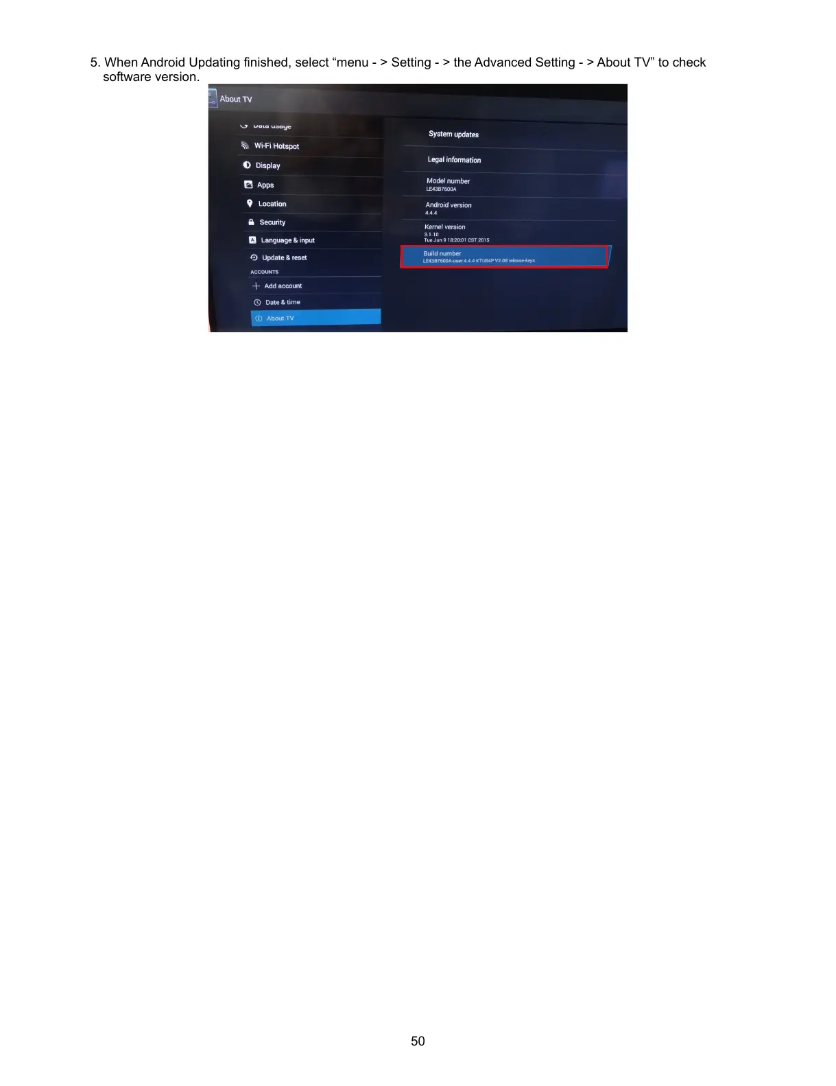 5. When Android Updating finished, select “menu - > Setting - > the Advanced Setting - > About TV” to check