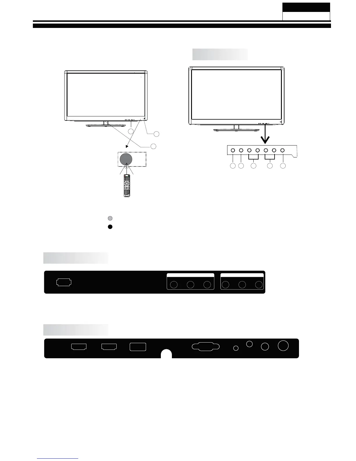 HDMI1, HDMI2, USB, VGA, PC AUDIO, HEADPHONE, COAXIAL, RF.