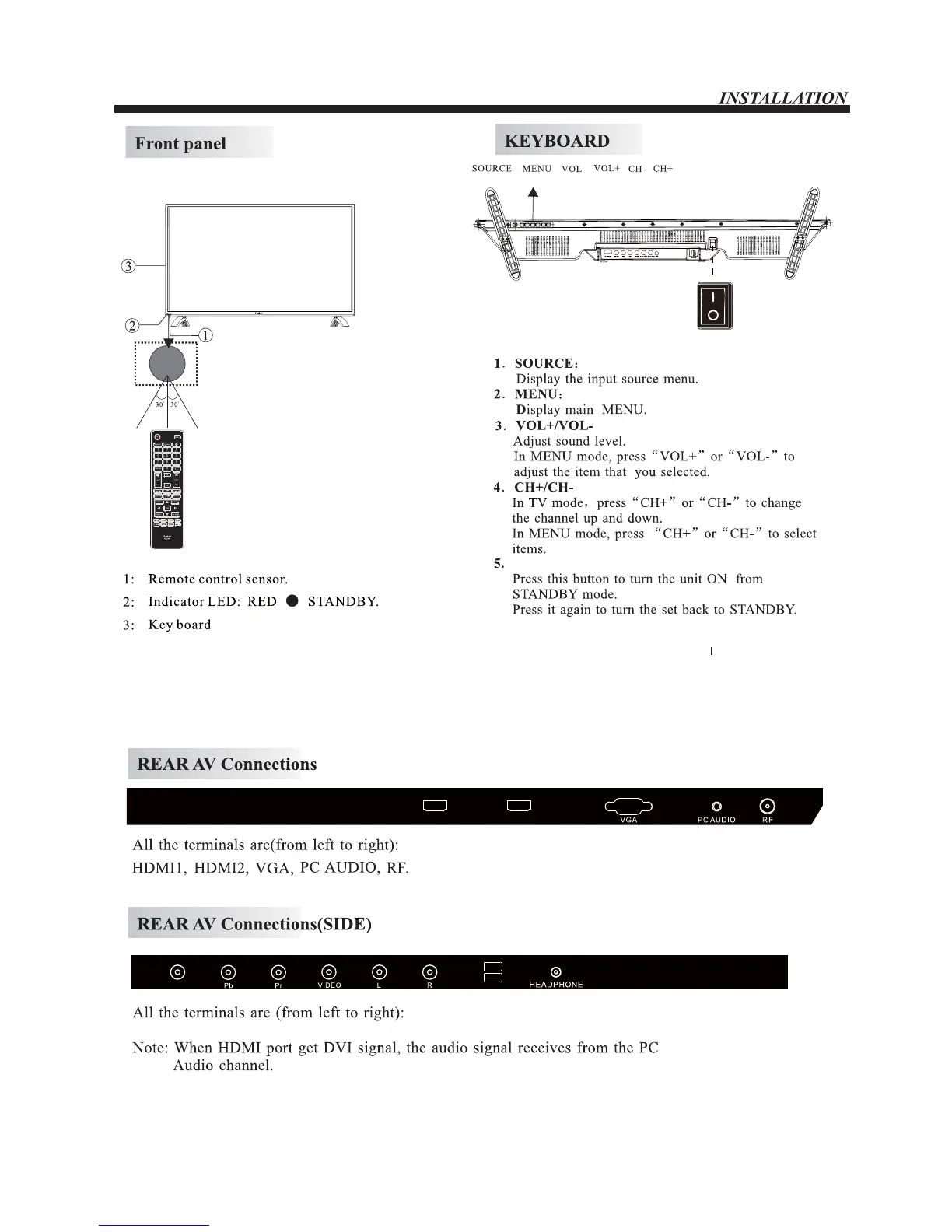 power switch on the TV (“ ” means connected),