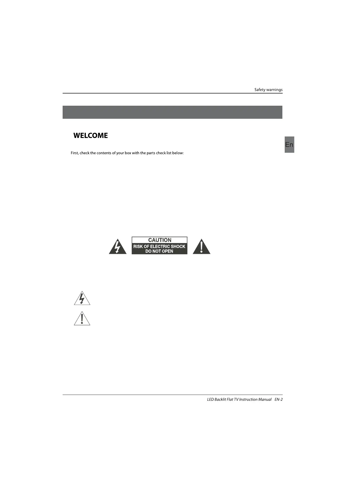 TO REDUCE THE RISK OF ELECTRIC SHOCK, DO NOT REMOVE COVER (OR BACK).NO USER SERVICEABLE PARTS INSIDE.