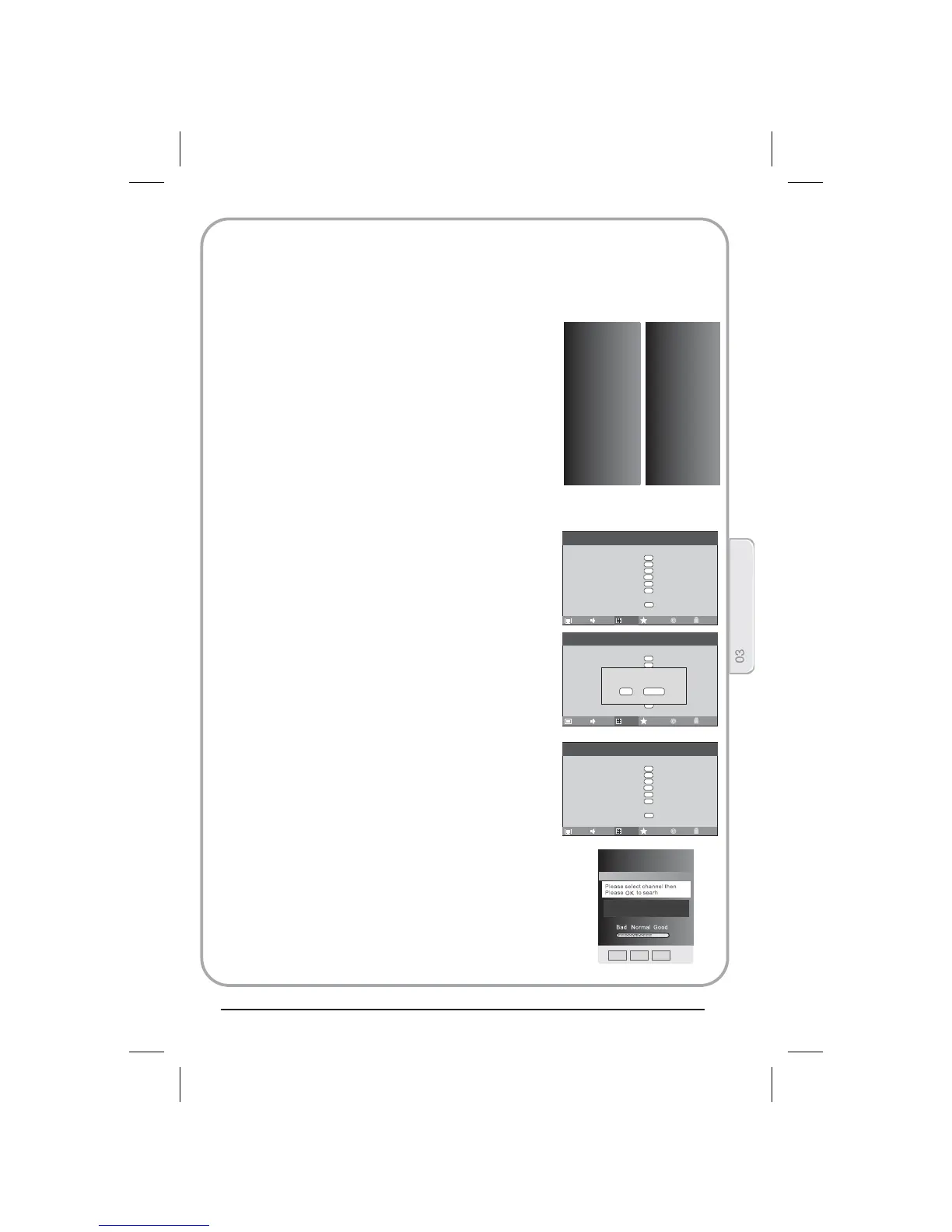 Druk op MENU; u kunt aangeven of u TV/DTV Search