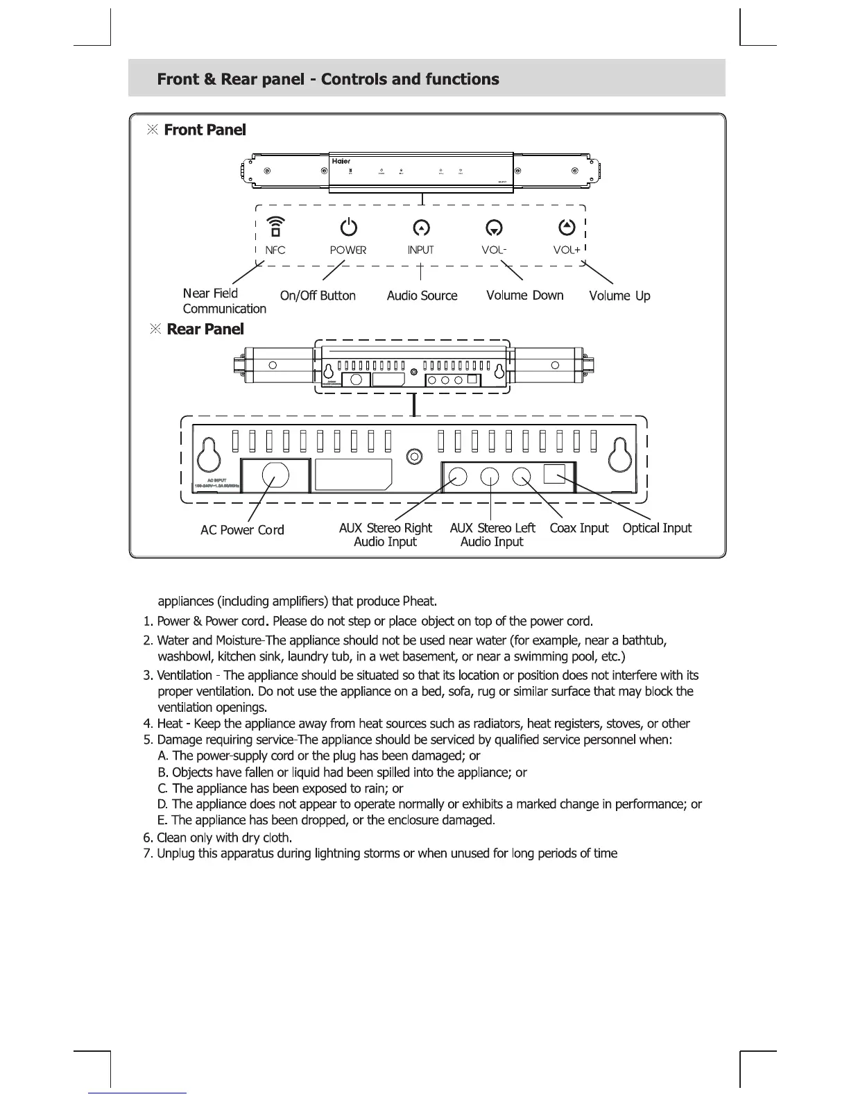 Haier SB-BT21 - Controls and Functions; Front and Rear Panel Layout; Appliance Precautions