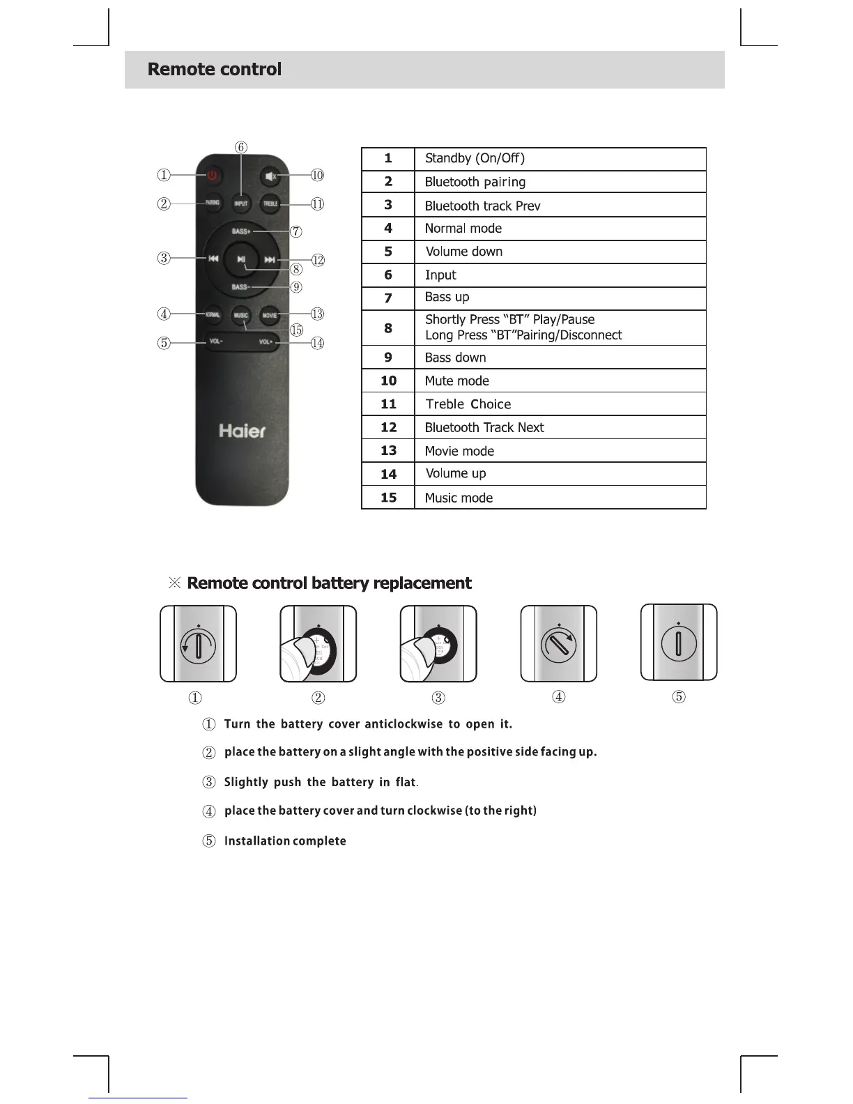 Haier SB-BT21 - Remote Control Operation; Battery Replacement