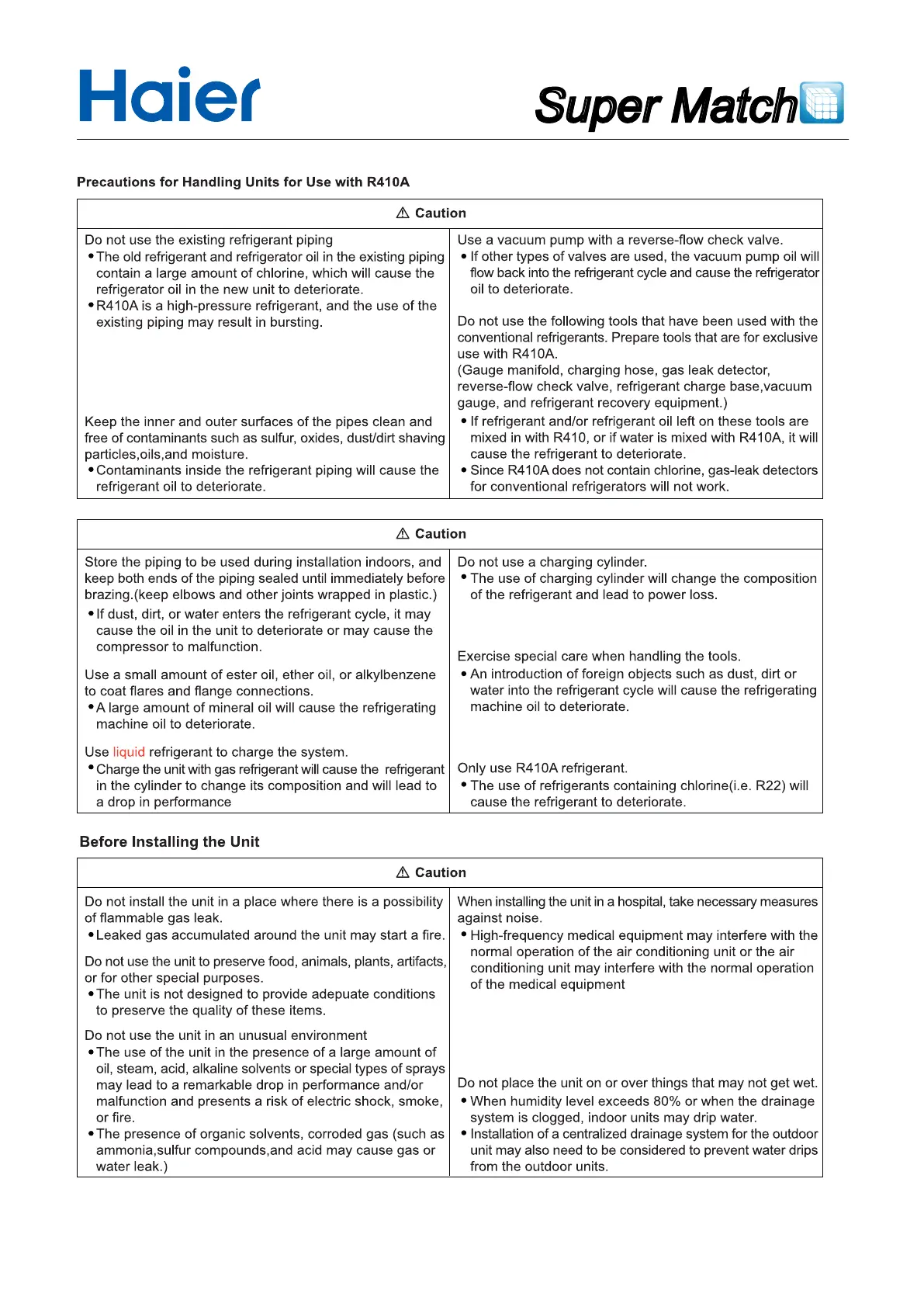 Haier Super Match AB24ES1ERA - Precautions for Handling Units for Use with R410 A