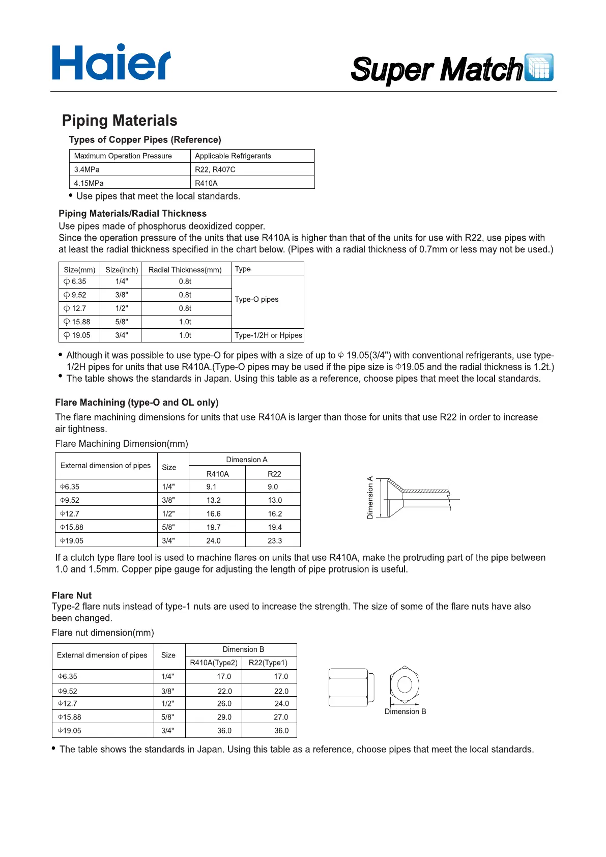 Haier Super Match AB24ES1ERA - Flare Nut; Types of Copper Pipes; Flare Machining; Piping Materials;Radial Thickness