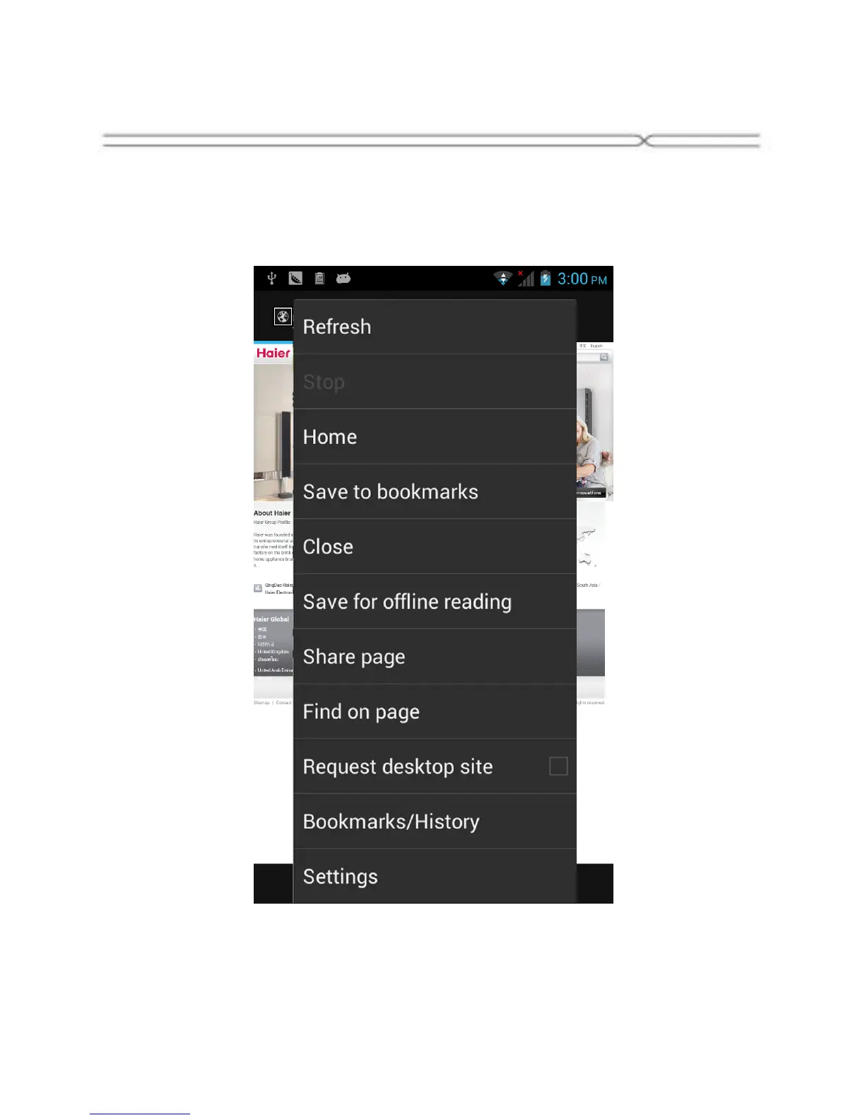 When you are viewing the web page, touch the Menu Key, the following