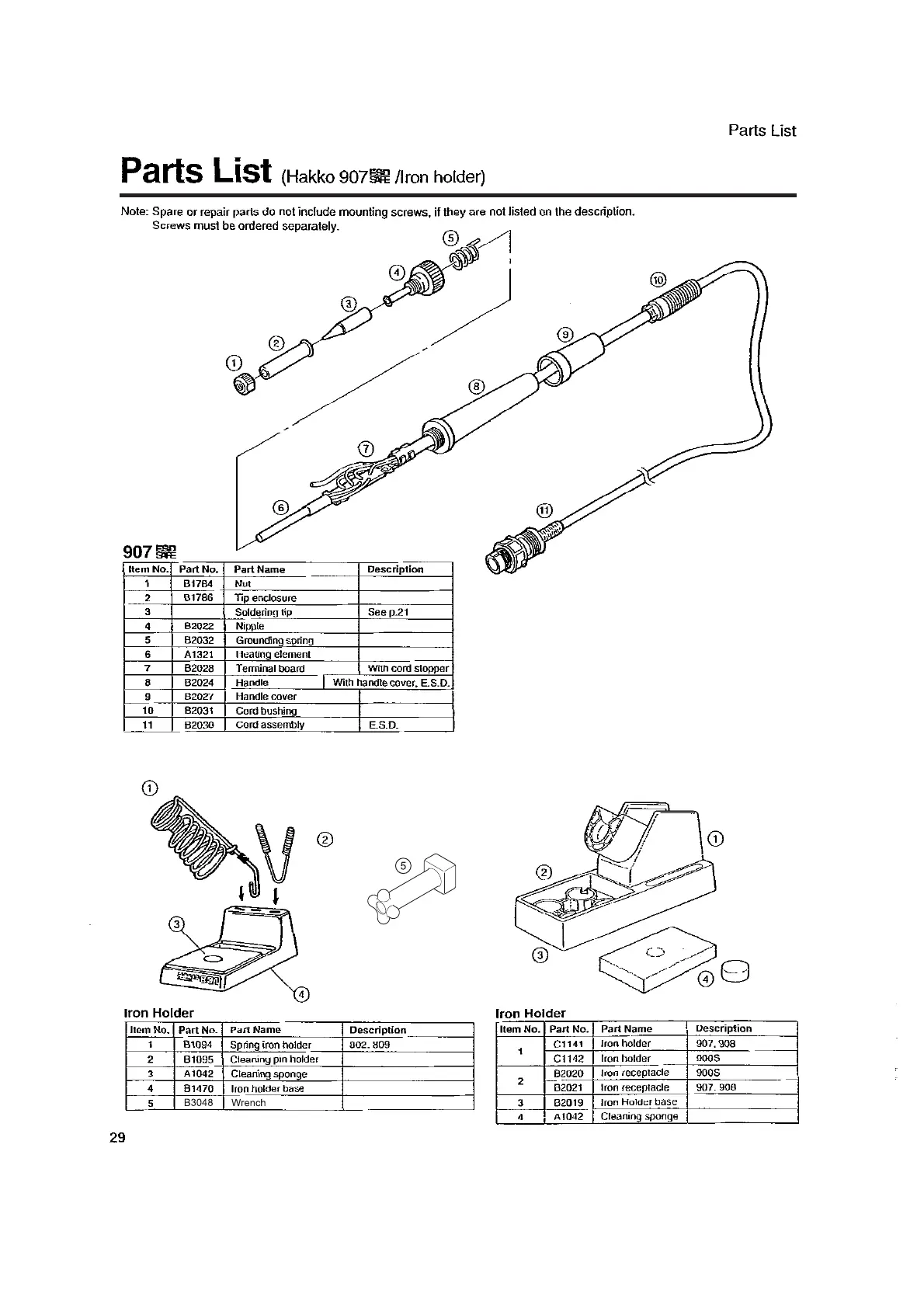 Hakko Electronics 702B - Parts List (Hakko 907;Iron holder)