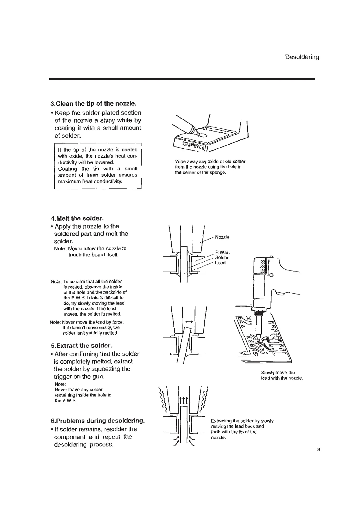 Hakko Electronics 702B - Clean the Tip of the Nozzle; Melt the Solder; Extract the Solder; Problems During Desoldering