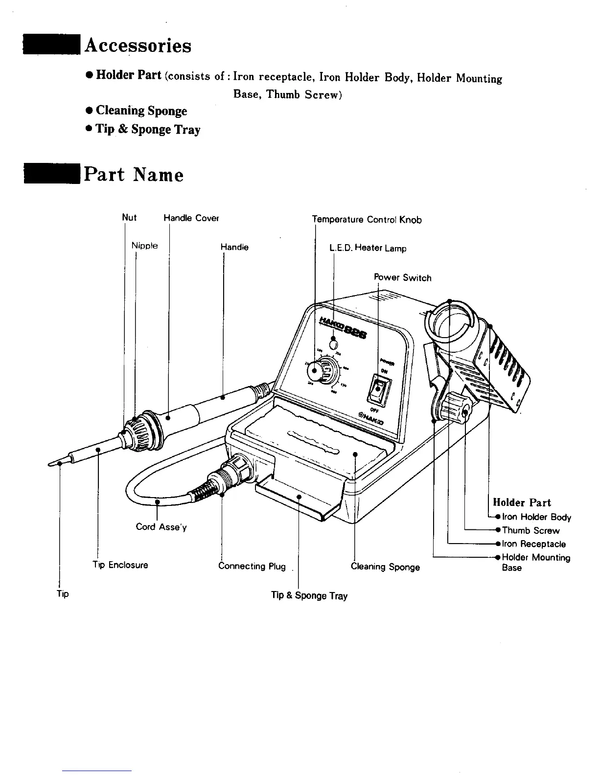 Hakko Electronics 926 - Product Accessories and Parts; Included Accessories List; Component Identification Diagram