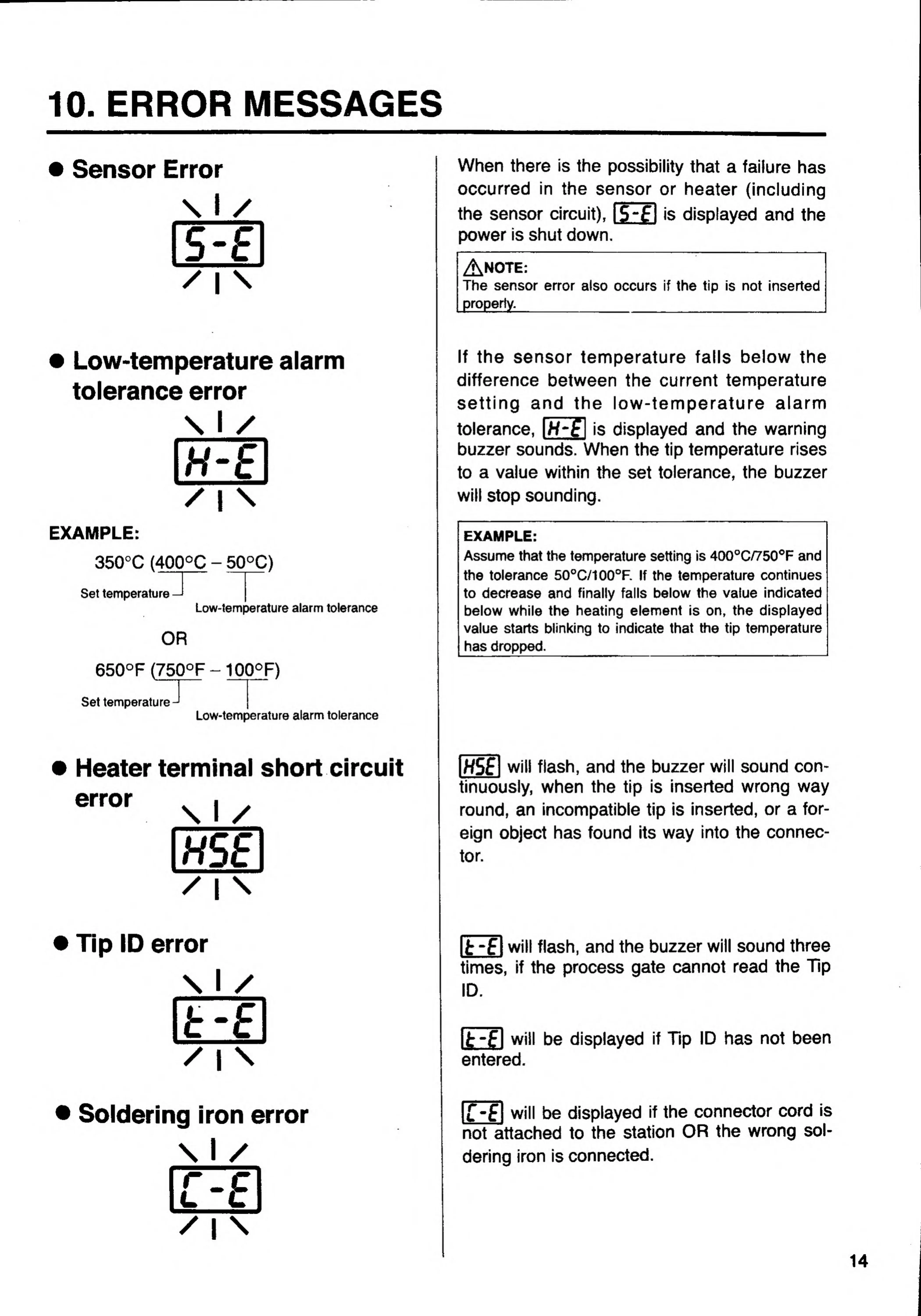 Hakko Electronics FM-202 - Error Messages and Codes; Sensor Error (S-E); Low-Temperature Alarm Error (H-E)