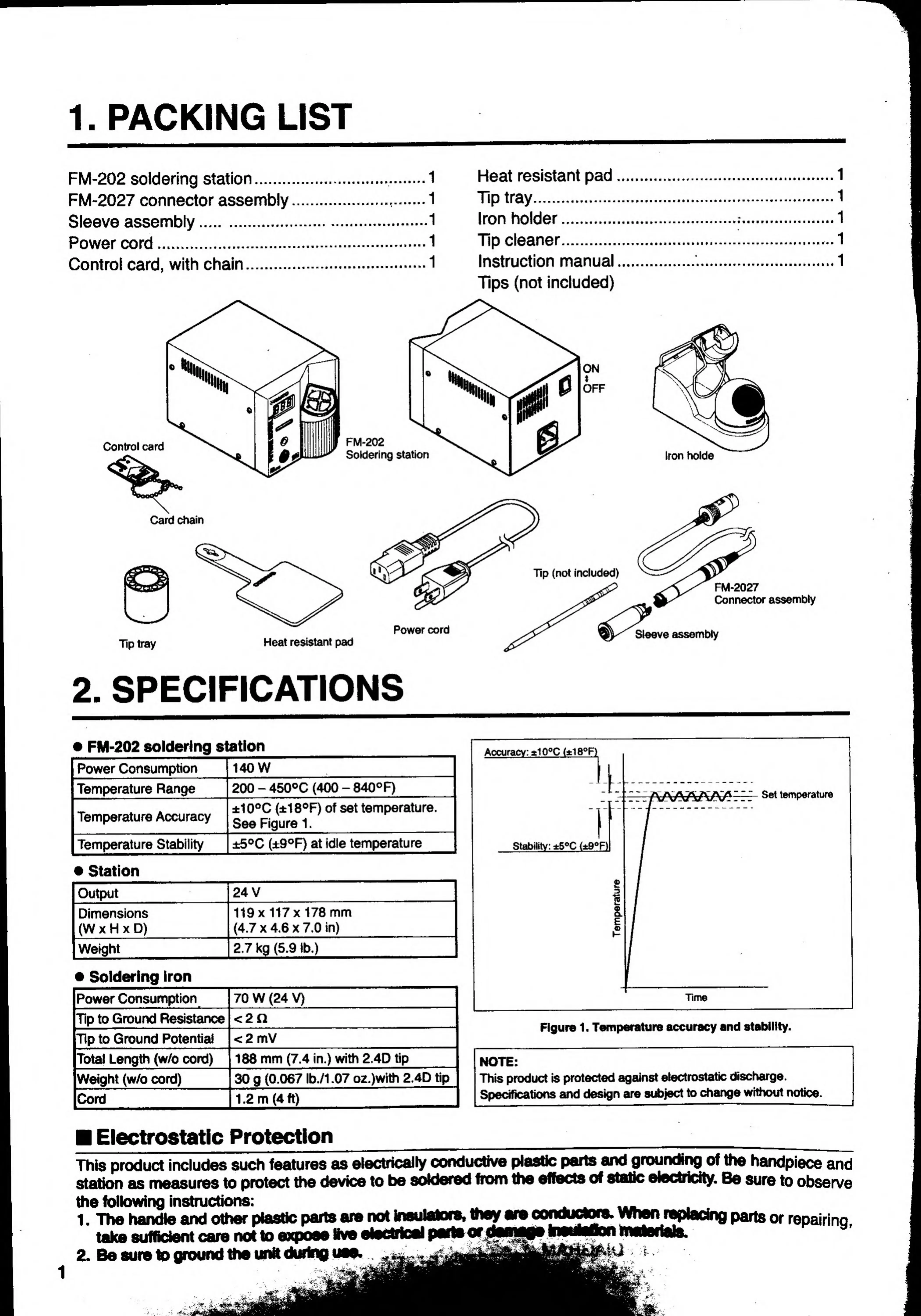 Hakko Electronics FM-202 - Specifications; FM-202 Soldering Station Specs; Station Unit Specifications; Soldering Iron Specifications