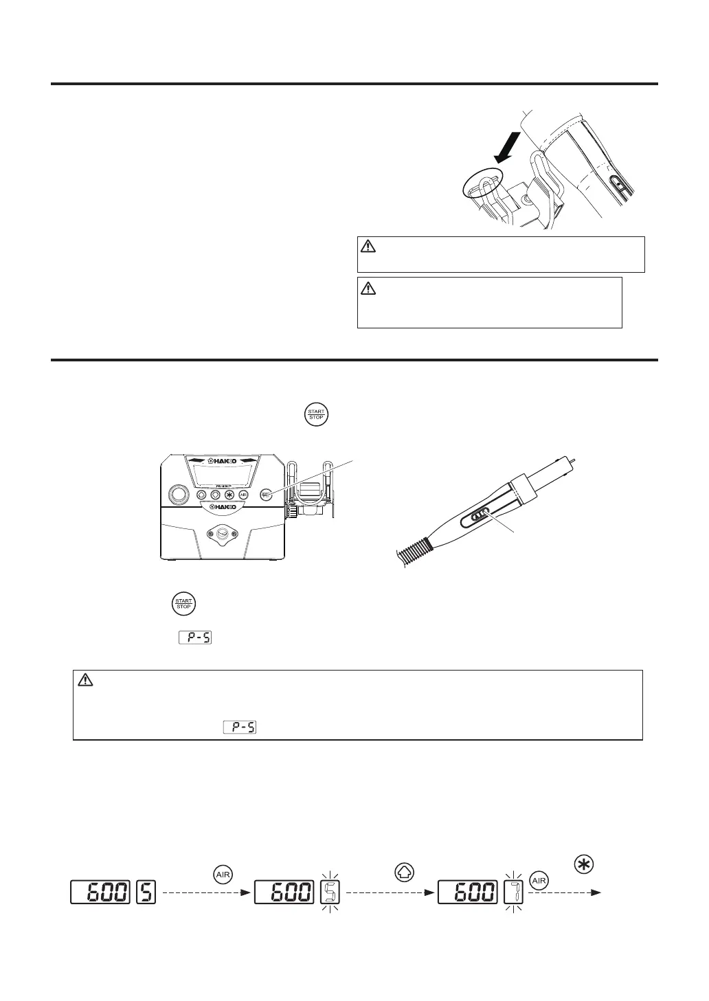 Press the “S” button on the handpiece or (START/STOP) button on the station to start blowing air. Hot