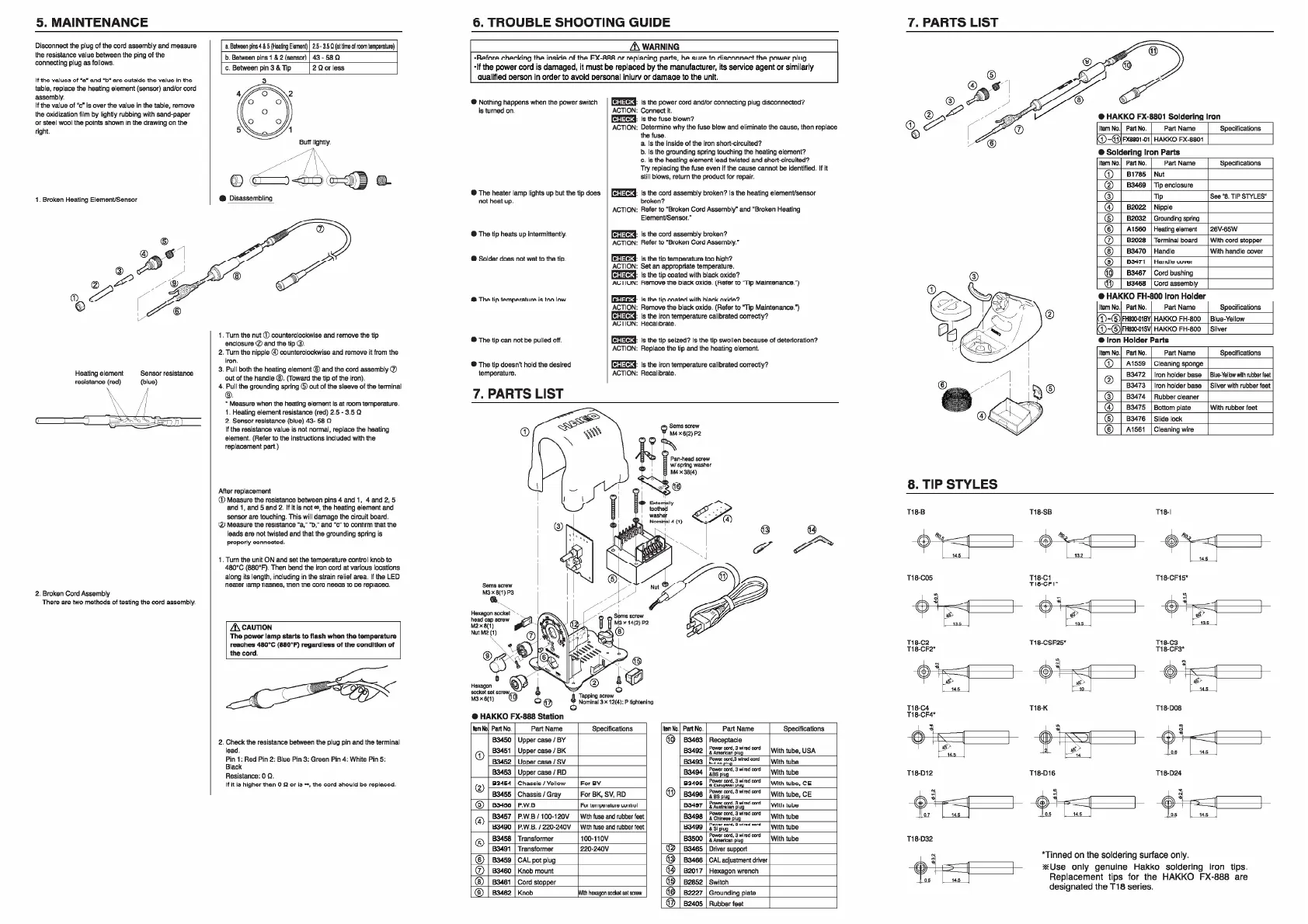 Hakko Electronics FX-888 - MAINTENANCE; Heating Element;Sensor Check; Cord Assembly Testing; TROUBLE SHOOTING GUIDE