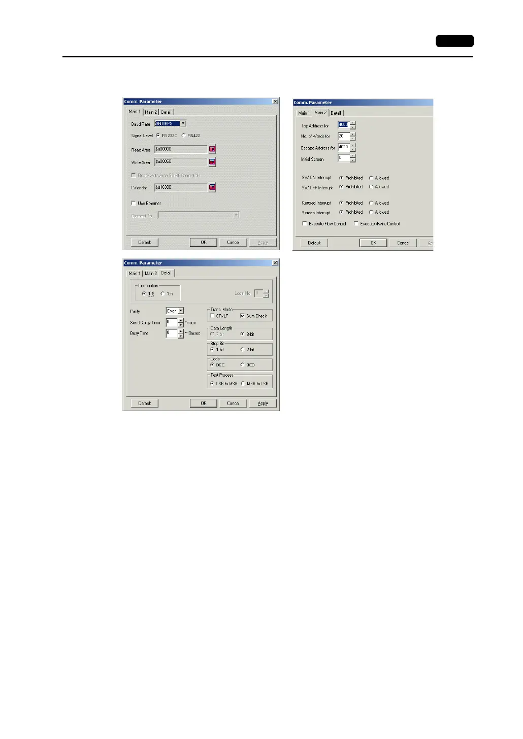 2. The [Comm. Parameter] dialog comes up. In the [Main 1], [Main 2], and [Detail] tab windows, set
