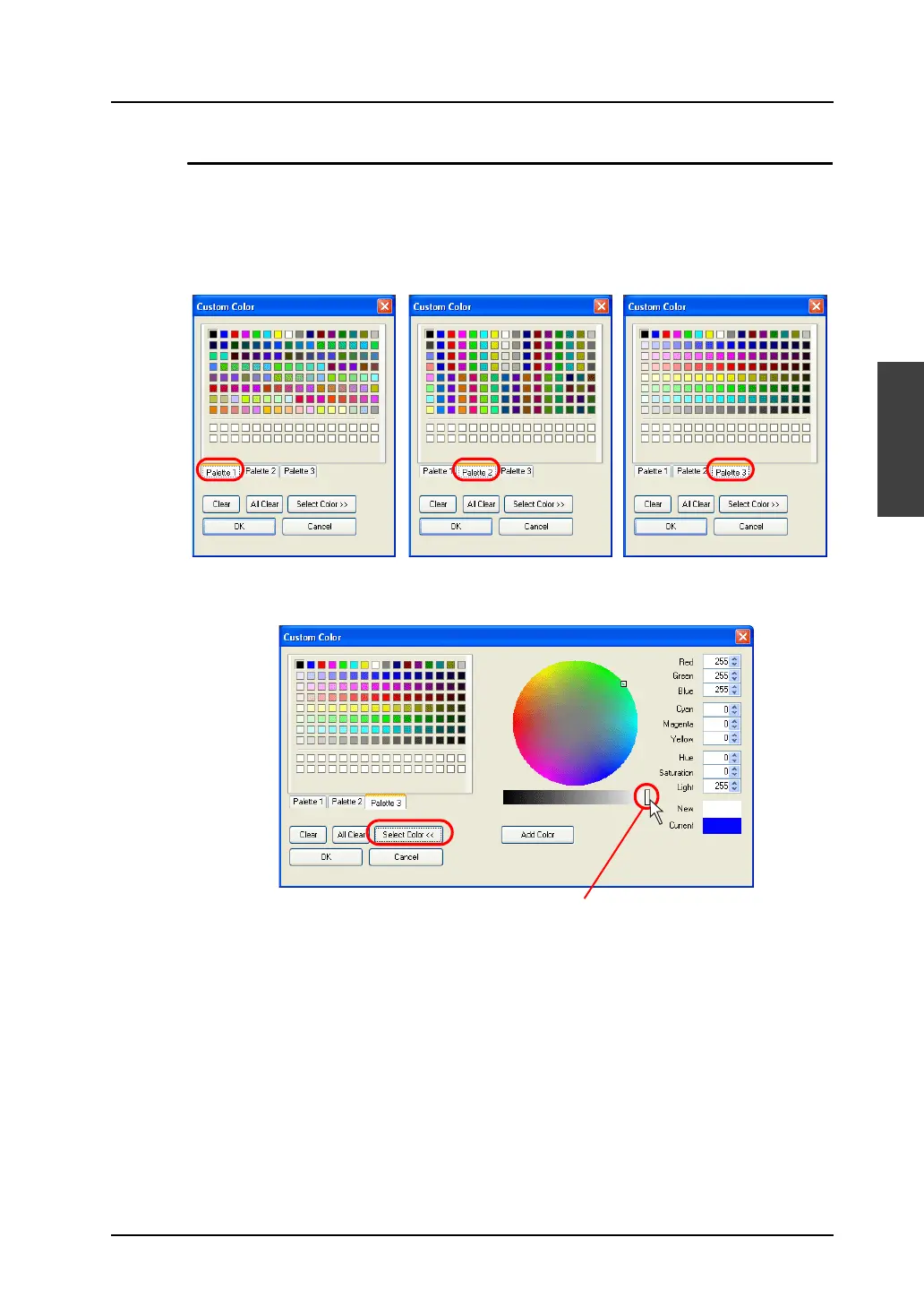 Clicking [Palette 1], [Palette 2], or [Palette 3] brings up its own color palette. Click your desired color