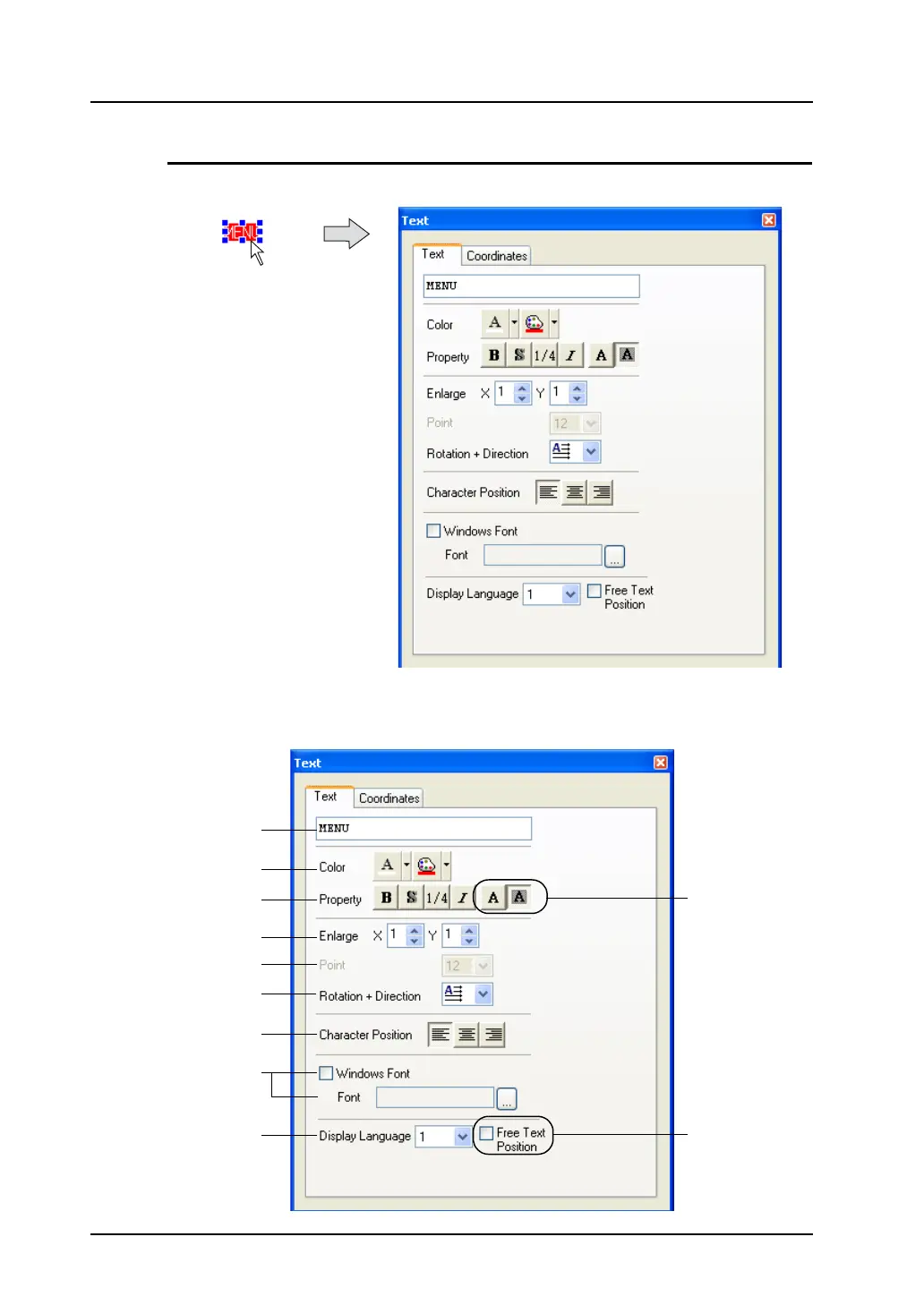 Clicking (or double-clicking) the [Text] item brings up the [Text] dialog shown below.