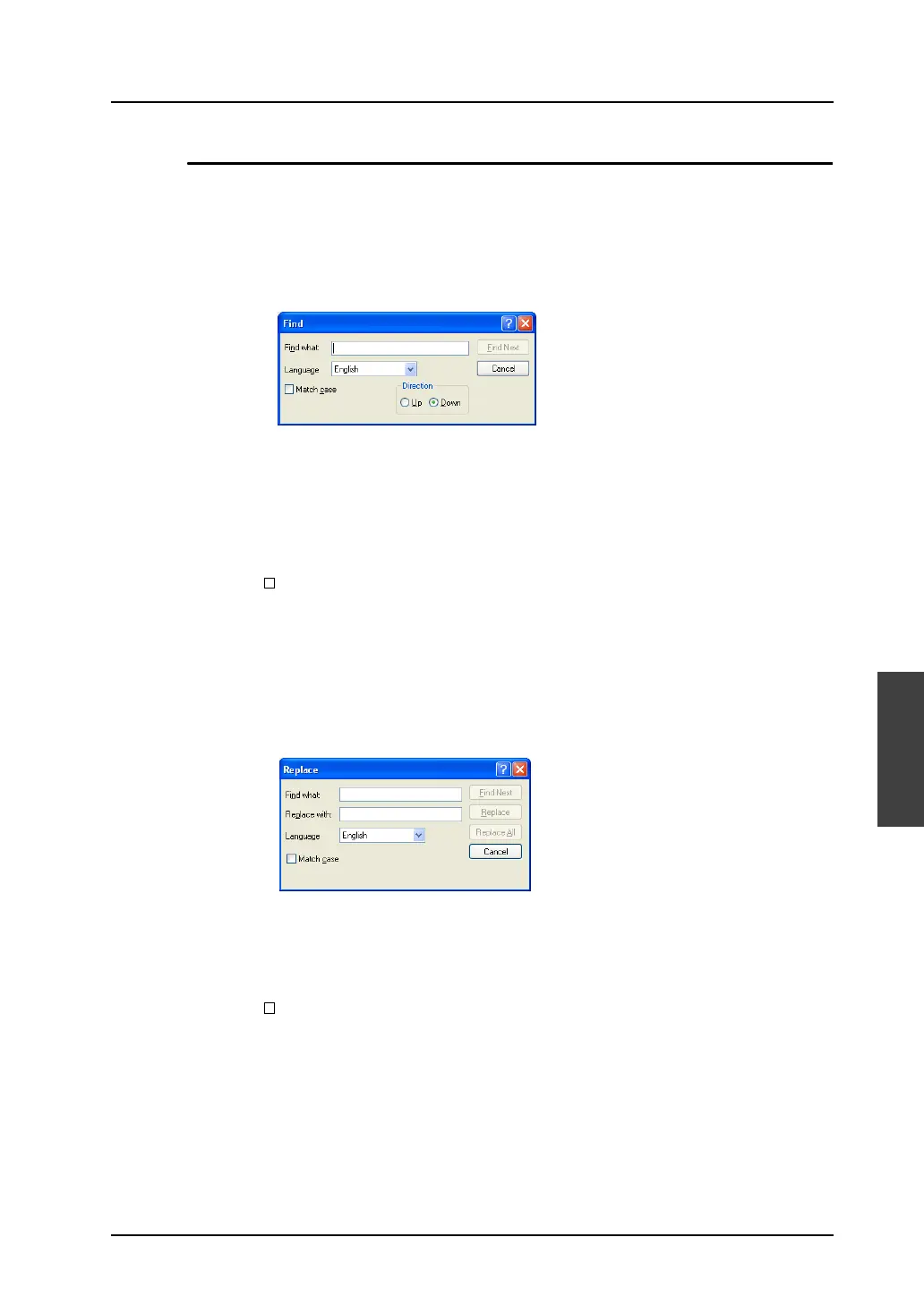 When [Replace] is clicked, the string for [Find what], if found during searching downward from the