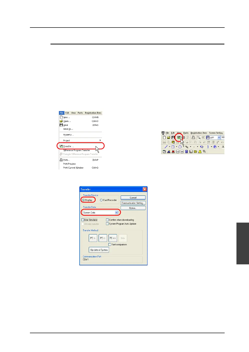 Select [Display] for [Transfer Device], and [Screen Data] for [Transfer Data].