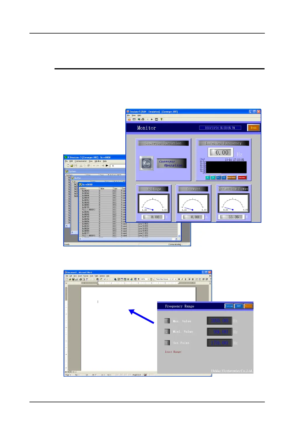 This means that Emulator replaces MONITOUCH and Simulator replaces the devices connected to