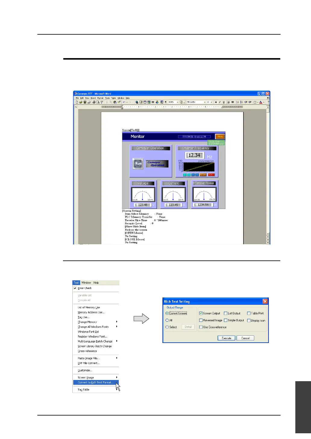 The contents of the screen data file can be converted to the Rich Text file (with a extension [.rtf]) as the