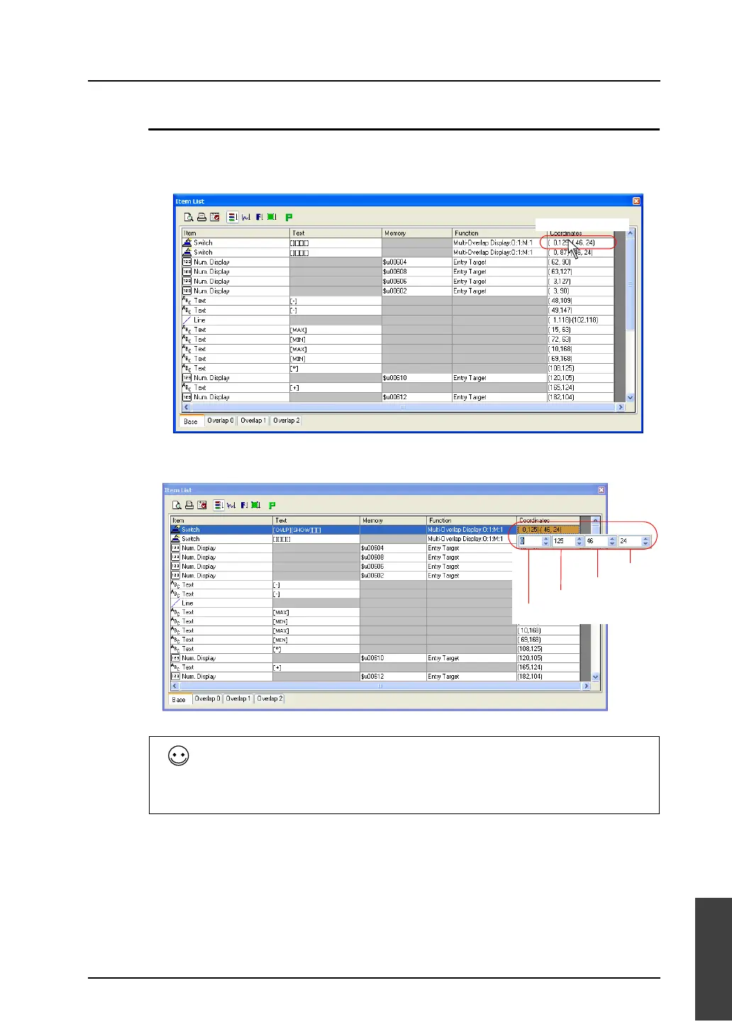 Coordinates specified for an item can be changed in the [Coordinates] column on the item list.