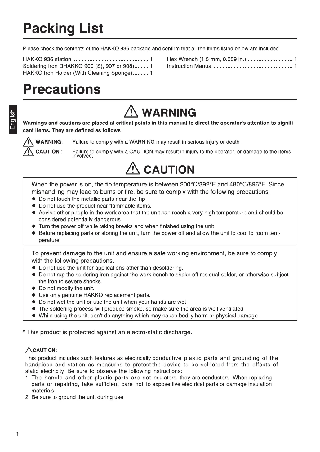 HAKO 936 - Packing List; Precautions