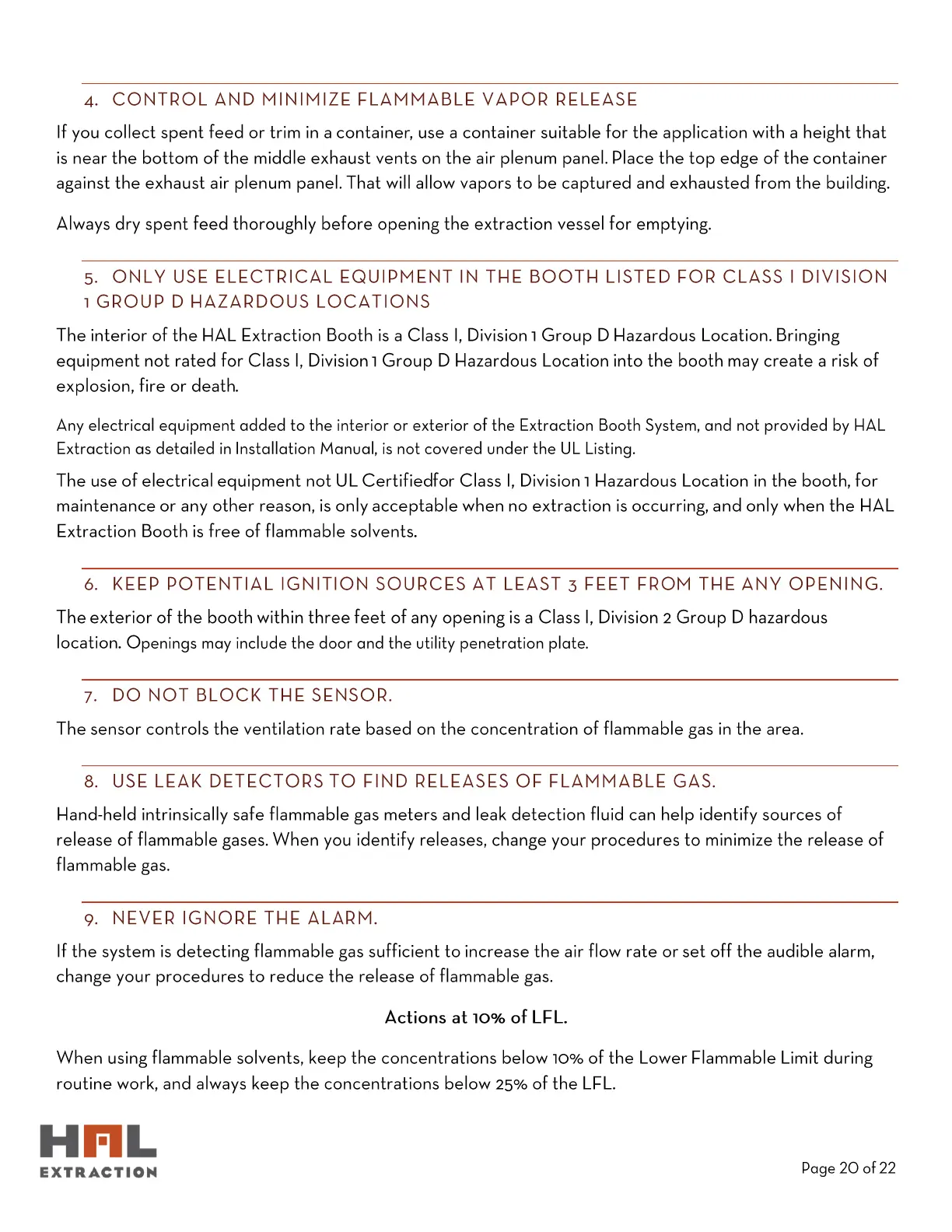HAL Extraction 150U - Control and Minimize Flammable Vapor Release; Use Only Class I Div 1 Grp D Electrical Equipment; Keep Ignition Sources 3 Feet from Opening; Never Ignore the Alarm