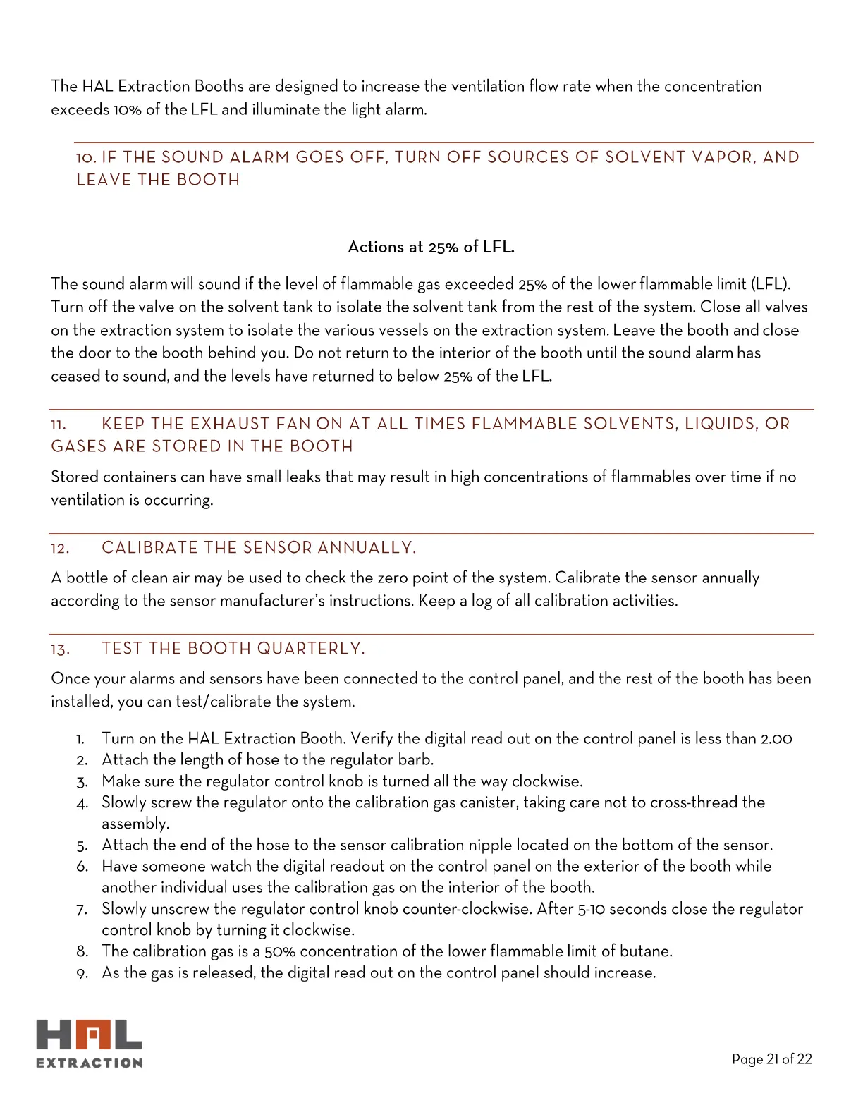 HAL Extraction 150U - If Sound Alarm Sounds, Take Action; Keep Exhaust Fan On For Stored Solvents; Calibrate the Sensor Annually; Test the Booth Quarterly