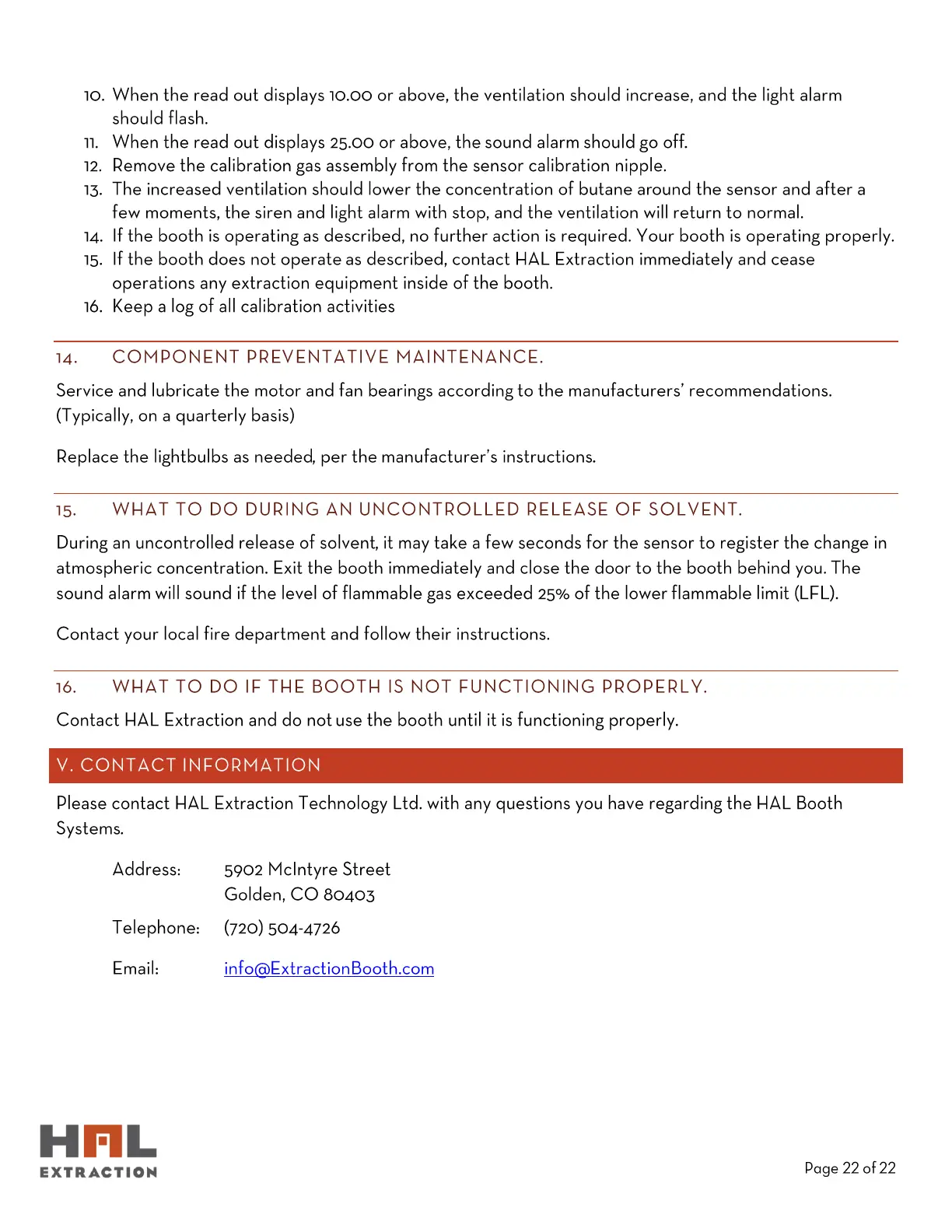 HAL Extraction 85U - 14. COMPONENT PREVENTATIVE MAINTENANCE; 15. UNCONTROLLED SOLVENT RELEASE RESPONSE; 16. HANDLING MALFUNCTIONS; V. CONTACT INFORMATION