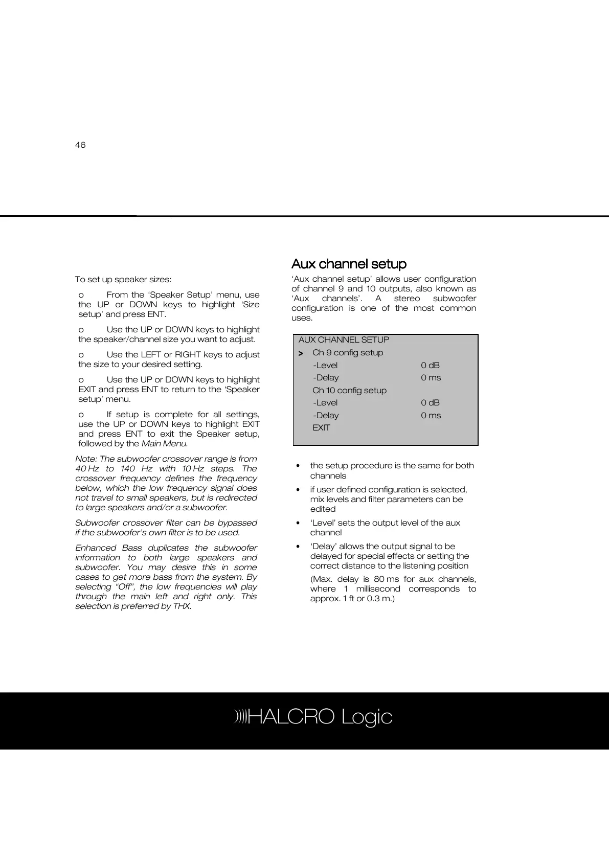 ‘Aux channel setup’ allows user configuration