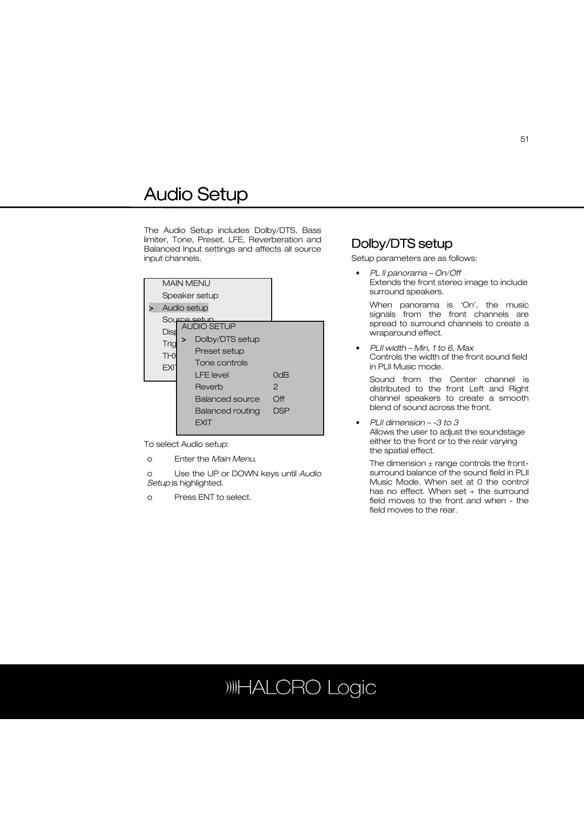 The Audio Setup includes Dolby/DTS, Bass