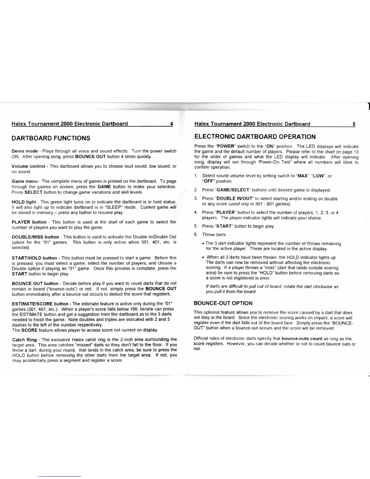 Halex Tournament 2000 - Dartboard Functions; Electronic Dartboard Operation