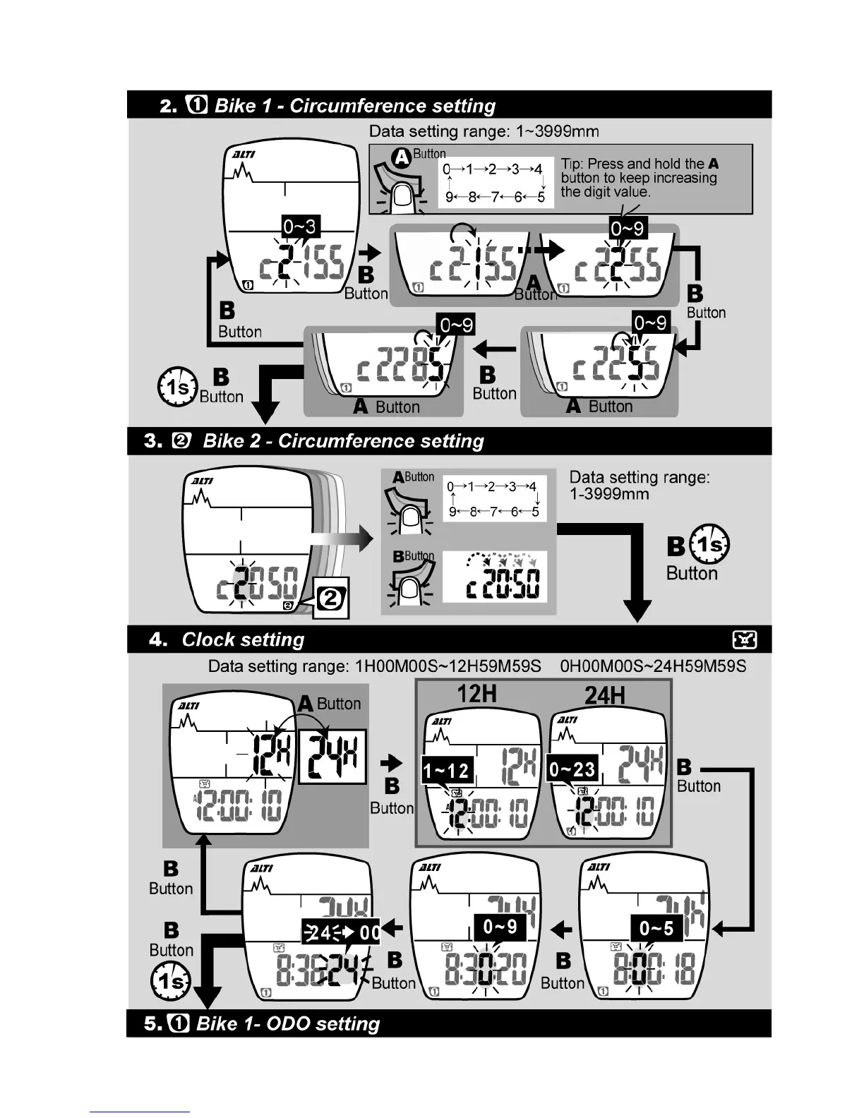 Halfords Bicycle Computer - Bike 1 Circumference Setting; Bike 2 Circumference Setting; Clock Setting; Bike 1 ODO Setting