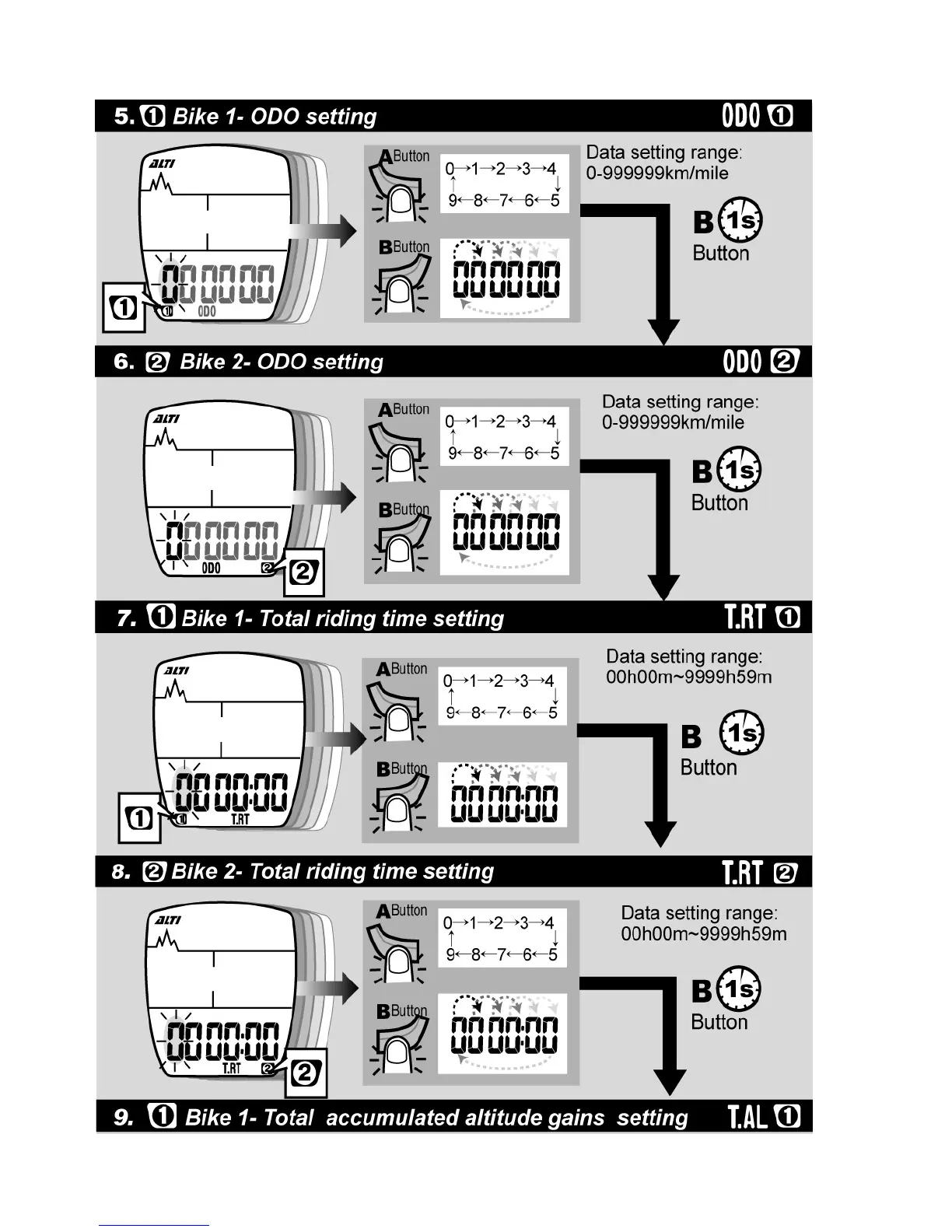 Halfords Bicycle Computer - Bike 2 ODO Setting; Bike 1 Total Riding Time Setting; Bike 2 Total Riding Time Setting; Bike 1 Total Accumulated Altitude Gains Setting