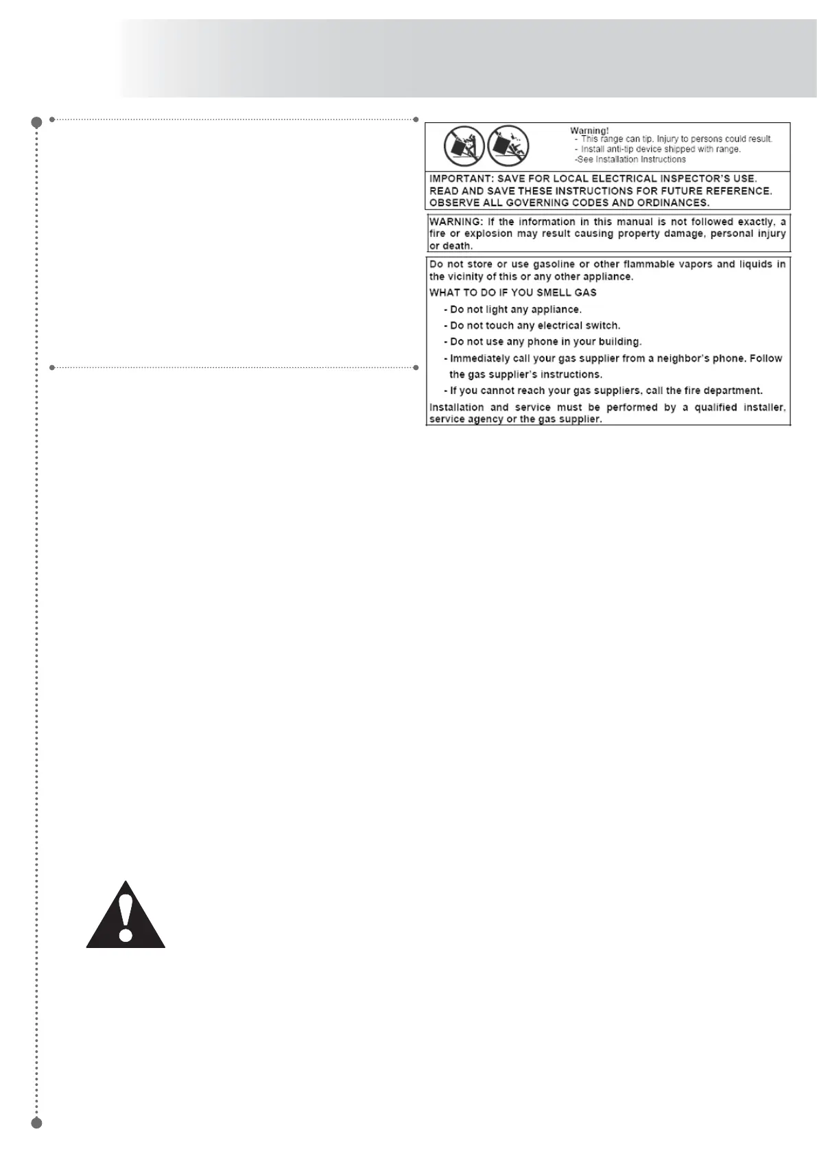 • Installation of any gas –fi red equipment should be made by a licensed plumber. A manual gas shut-off valve must