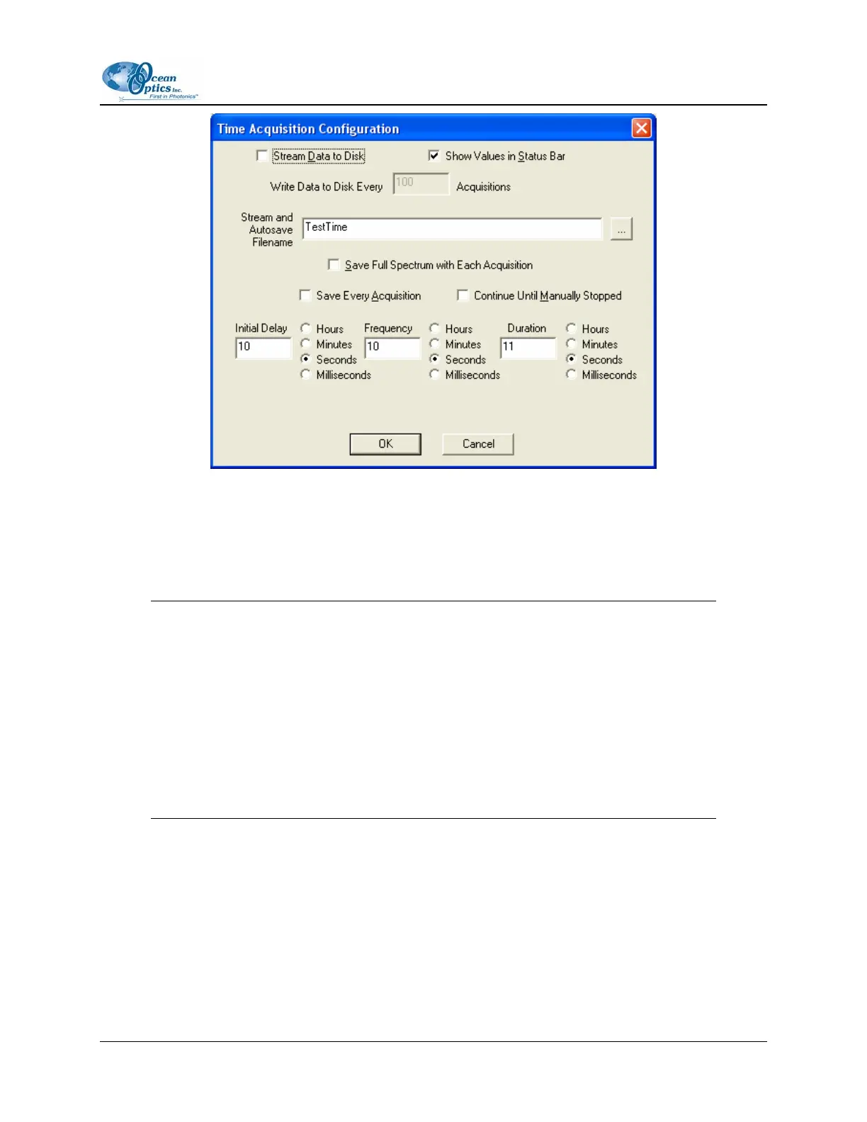 5. Name the Stream Filename for the time acquisition process. Clicking on the ellipsis to the right