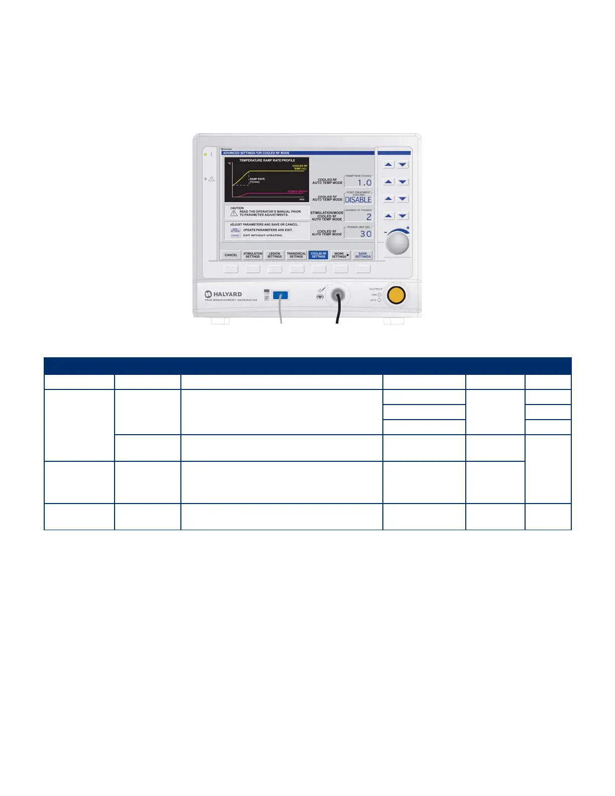 The following screen appears when COOLED RF SETTINGS is selected from the ADVANCED SETTINGS Mode: