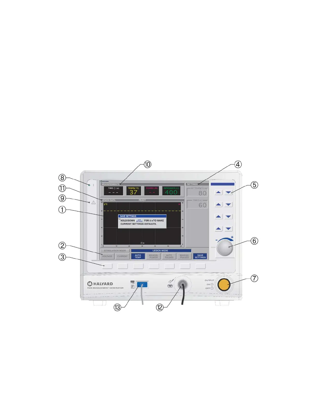 3. Mode Function Keys: These keys select and change the state of operation. For HALYARD* Pain Management Thermocouple RF probes, STIMULATION or LESION