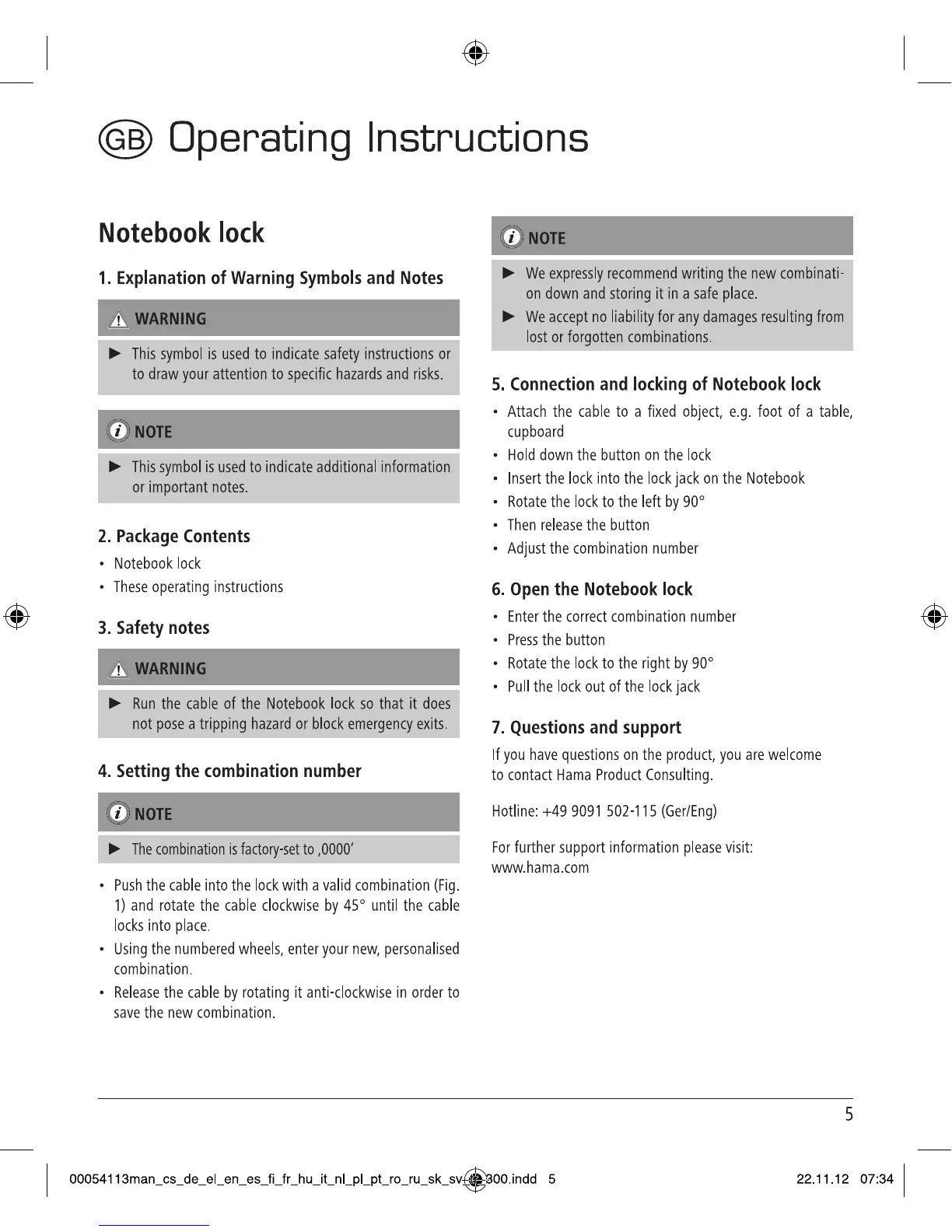 Hama Numeric Lock - Hama Notebook Lock Operating Instructions; Warning Symbols and Notes Explained; Package Contents; Safety Precautions