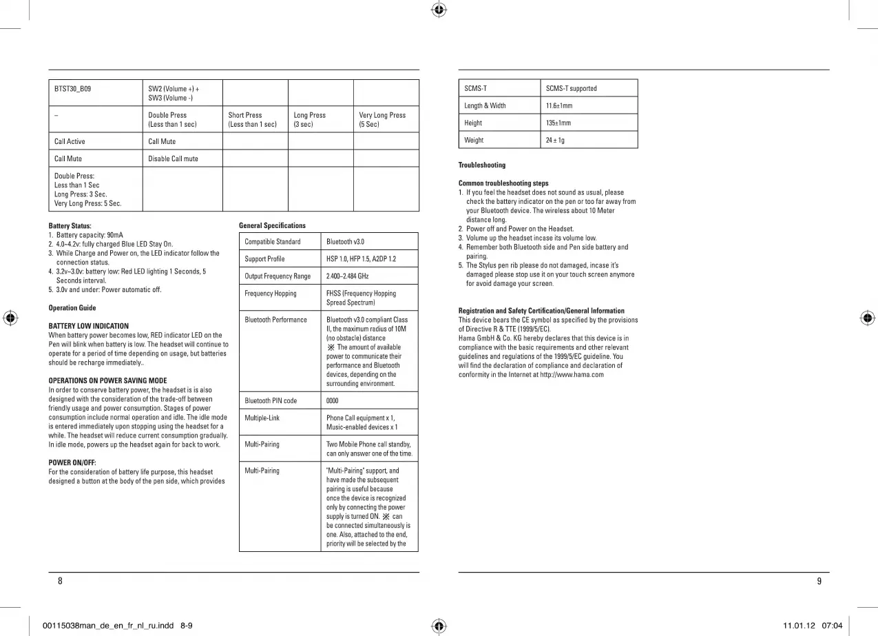 Hama Pen - Operation and Specifications; Battery Status Indicators; Operation Guide; Power On;Off