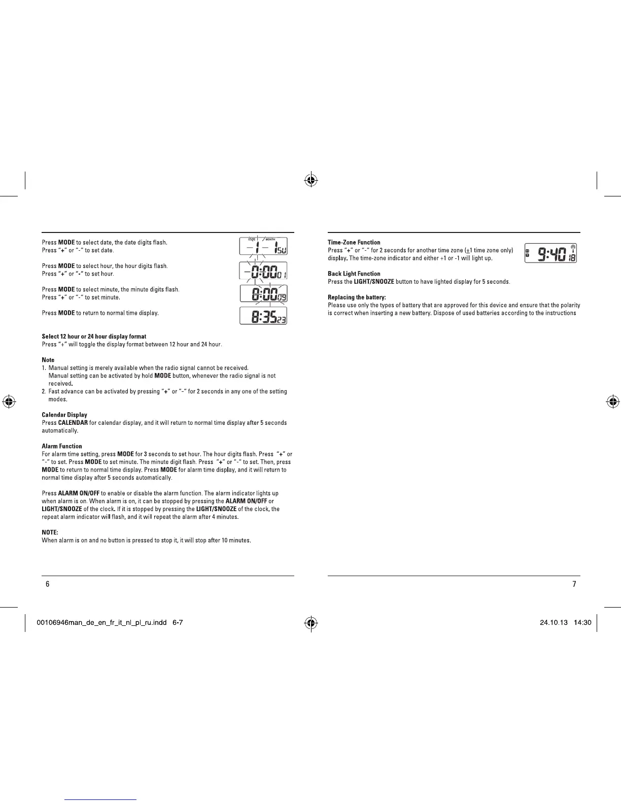 Hama RC 40 - Operating Instruction; Battery Installation; Time-Zone Function; Back Light Function