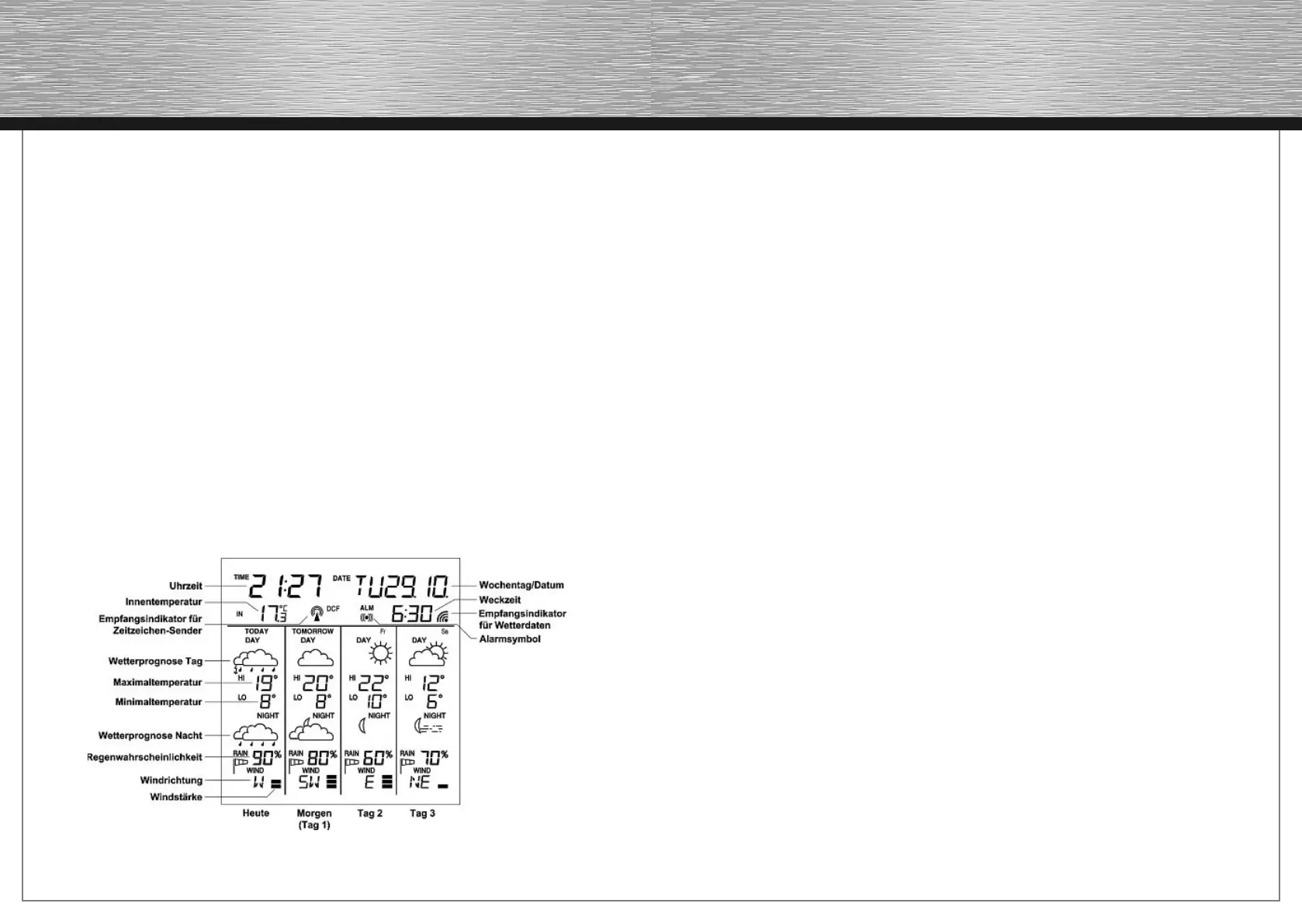 Zusätzlich verfügt die Wetterstation über eine Uhr mit Weckfunktion, die über die Zeitzeichensender automatisch eingestellt wird und