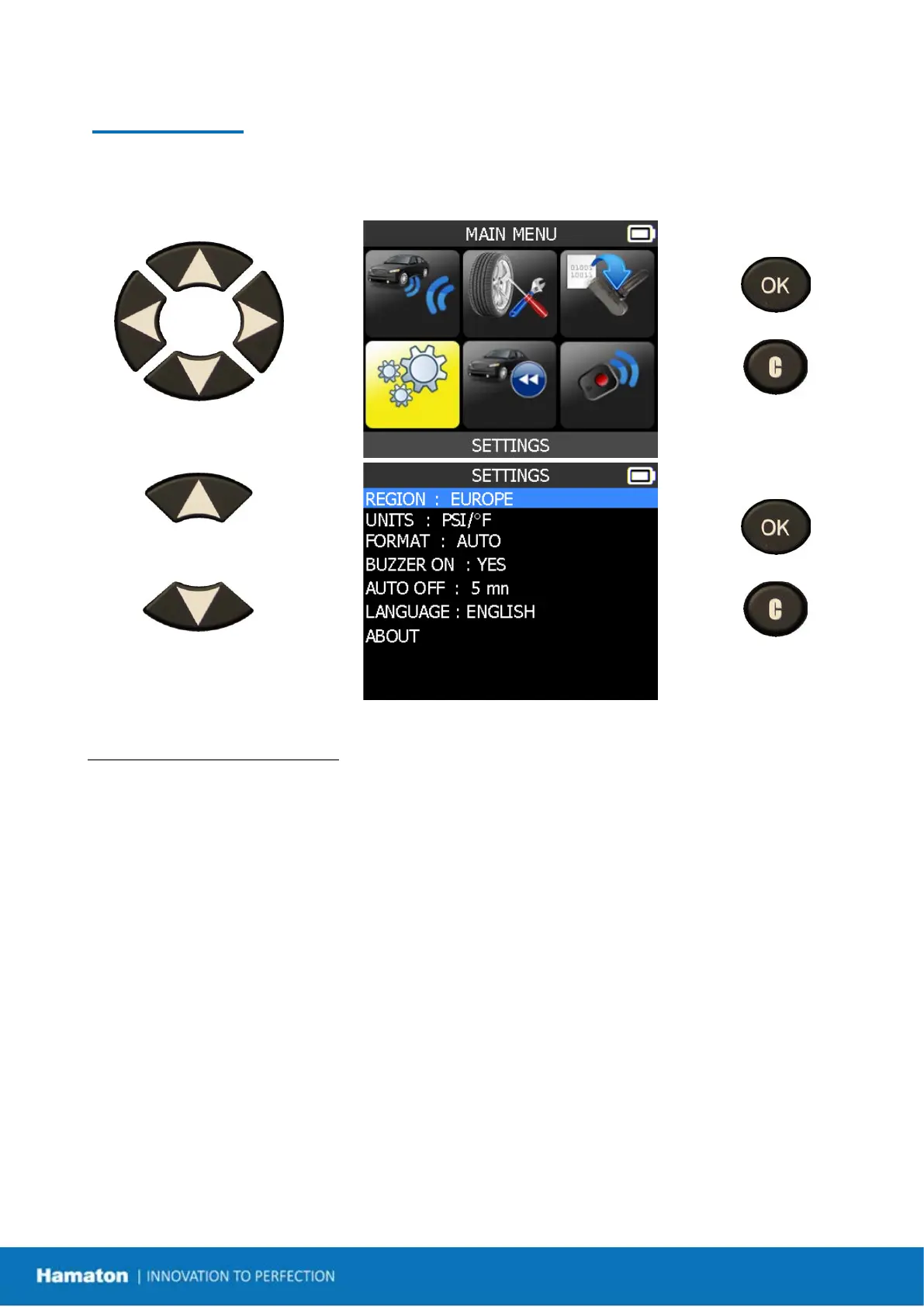 UNITS: change the air pressure and temperature display (kPa, Bar or PSI with F° or C°).