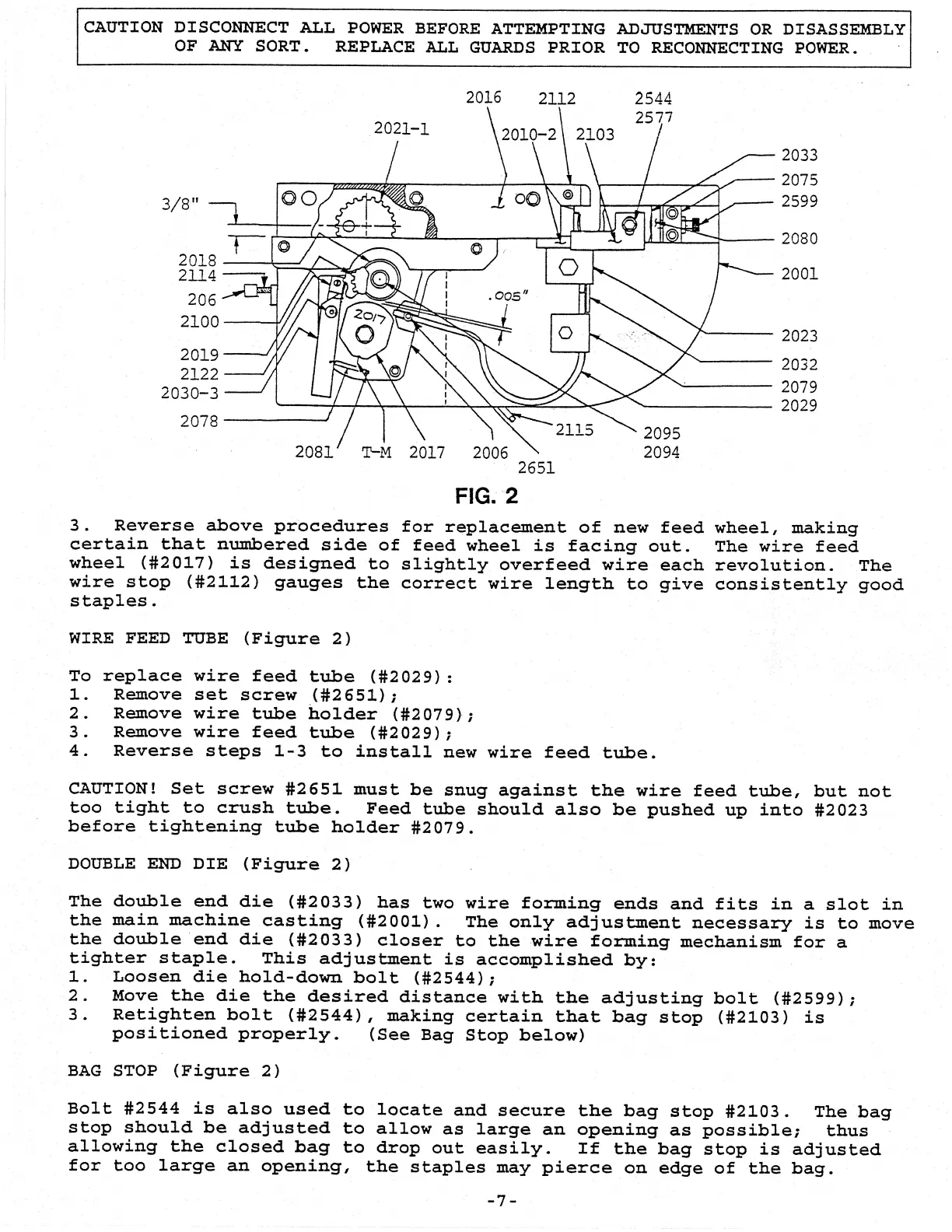 Hamer 125 - WIRE PATH COMPONENTS; Wire Feed Tube Replacement; Double End Die Adjustment; Bag Stop Adjustment