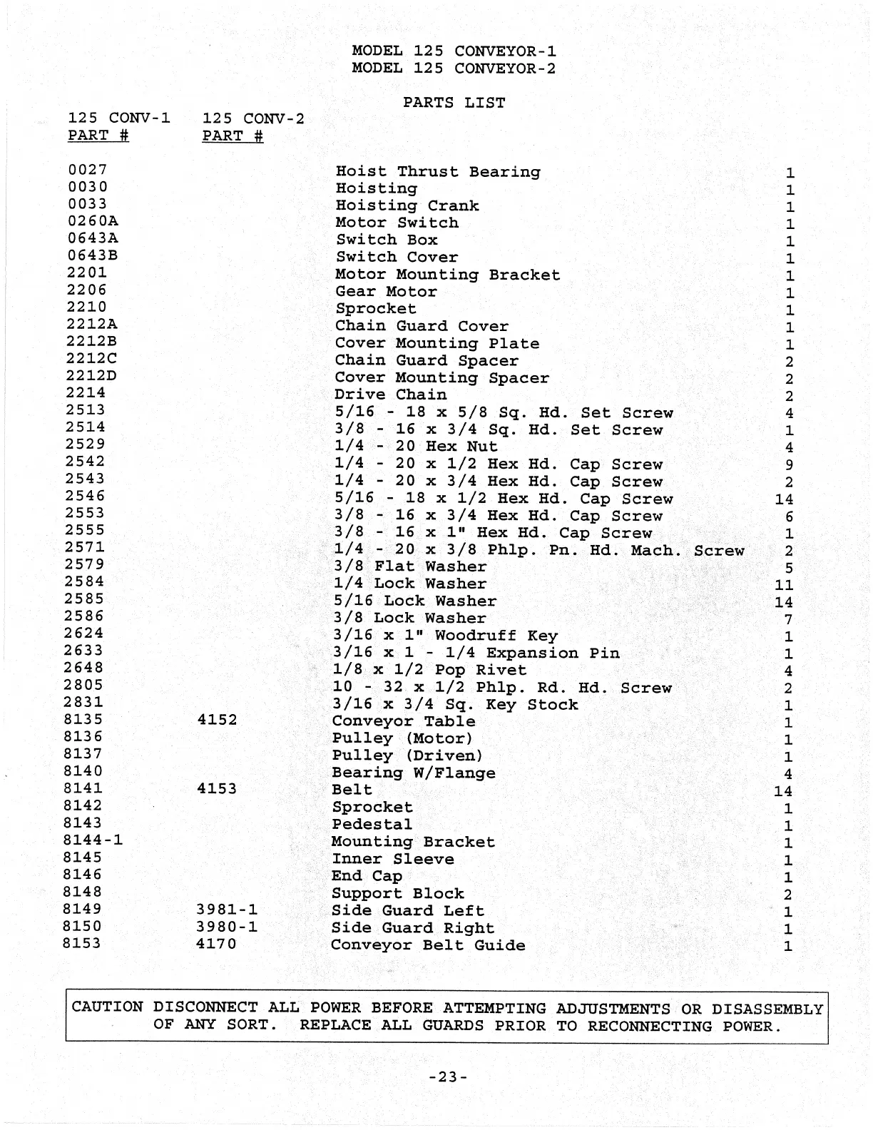 Hamer 125 - ACCESSORY PARTS LIST; Model 125 Conveyor Parts