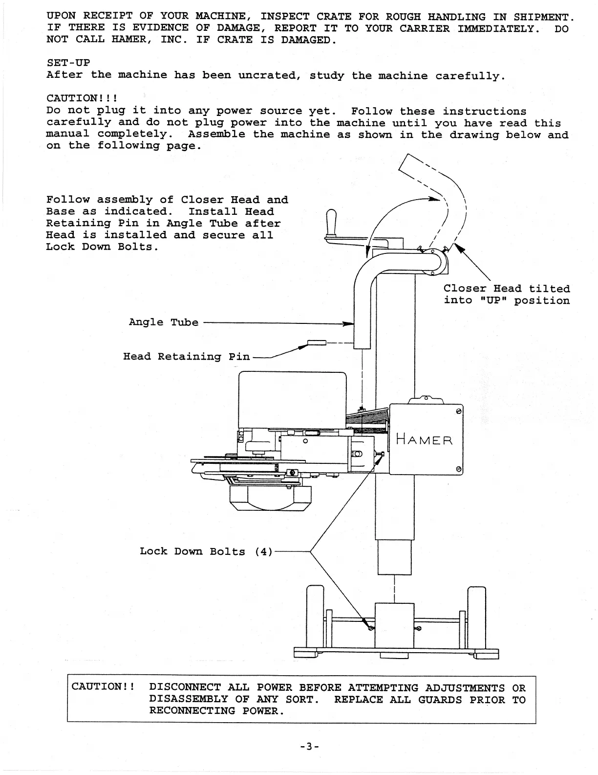 Hamer 125 - SET-UP AND INITIAL ASSEMBLY; Machine Inspection Upon Receipt; Initial Machine Assembly