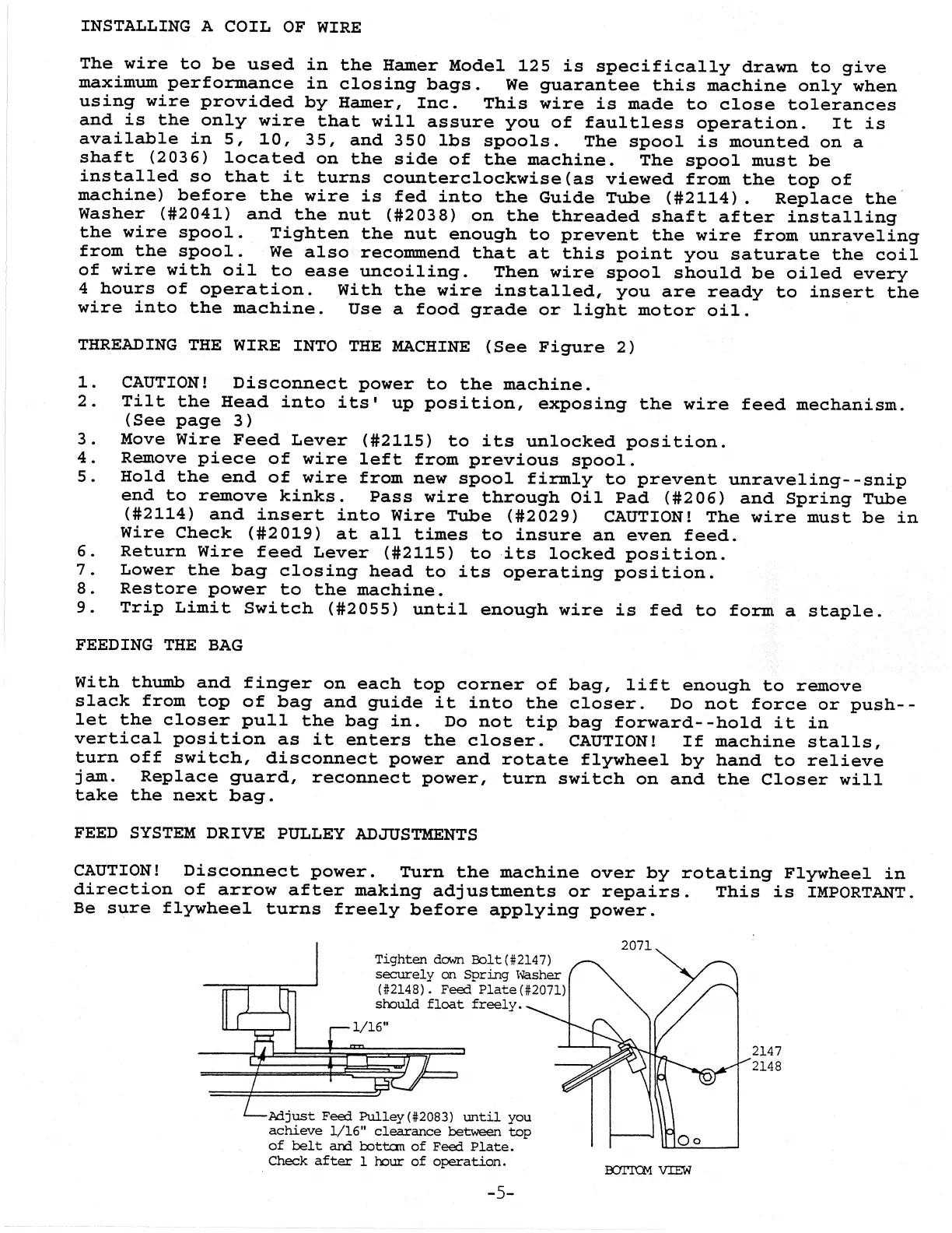Hamer 125 - WIRE FEED SYSTEM SETUP; Installing and Preparing Wire Spool; Threading Wire into Machine; Bag Feeding Procedure